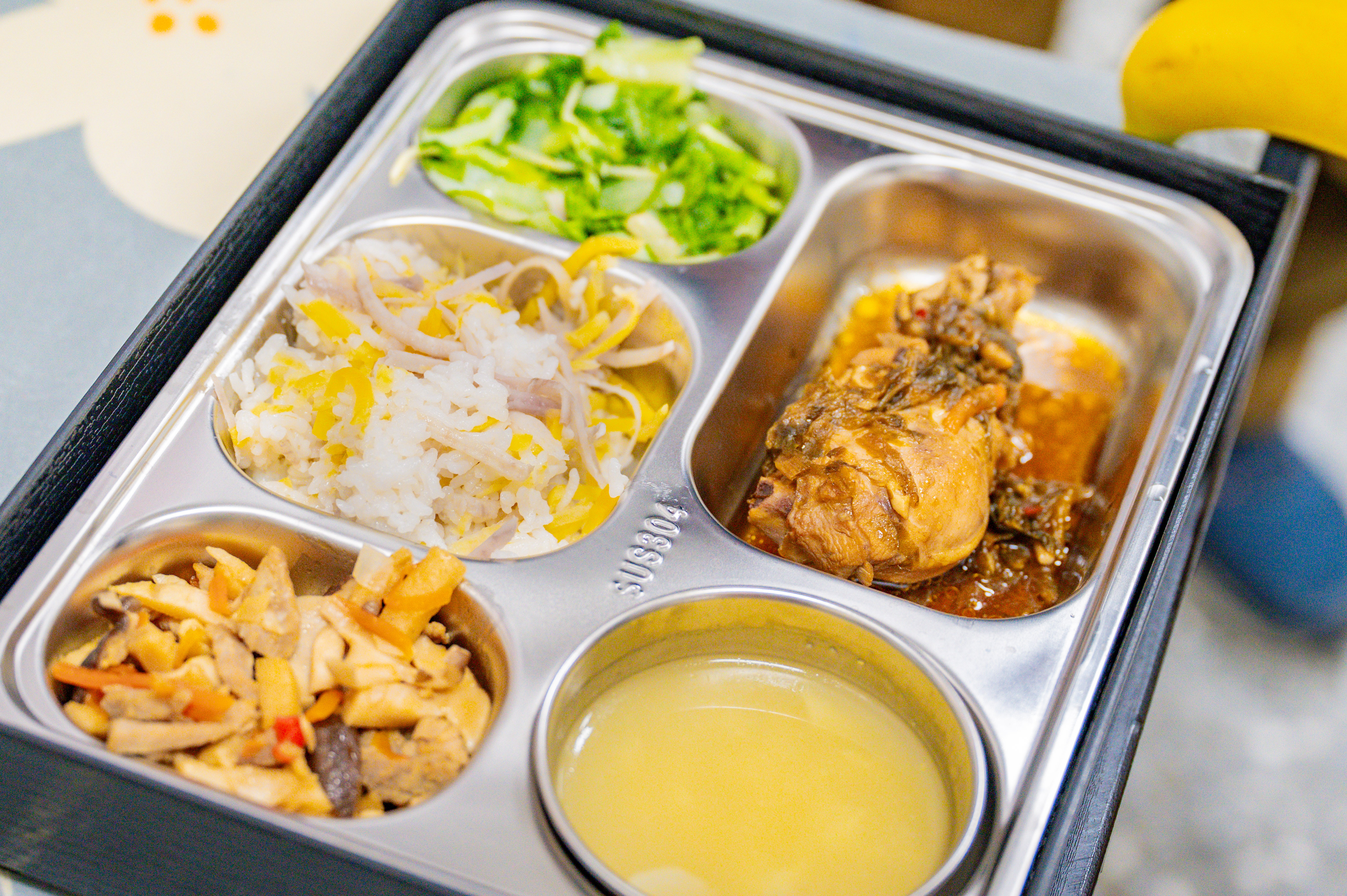 今日市長與龍星國小學生共同體驗採收小白菜,並一同享用午餐。今日菜色相當豐富,包括芋頭地瓜飯、梅乾菜醬滷雞腿、綠竹筍炒肉絲、有機小白菜、紅藜玉米濃湯及國產香蕉,其中,綠竹筍炒肉絲及紅藜玉米濃湯皆選用來自大溪區的在地食材,梅乾菜醬滷雞腿則結合客家文化特色,透過餐食讓在地文化融入孩子的日常生活,落實「吃當季、食在地」理念,也支持本市農業發展。