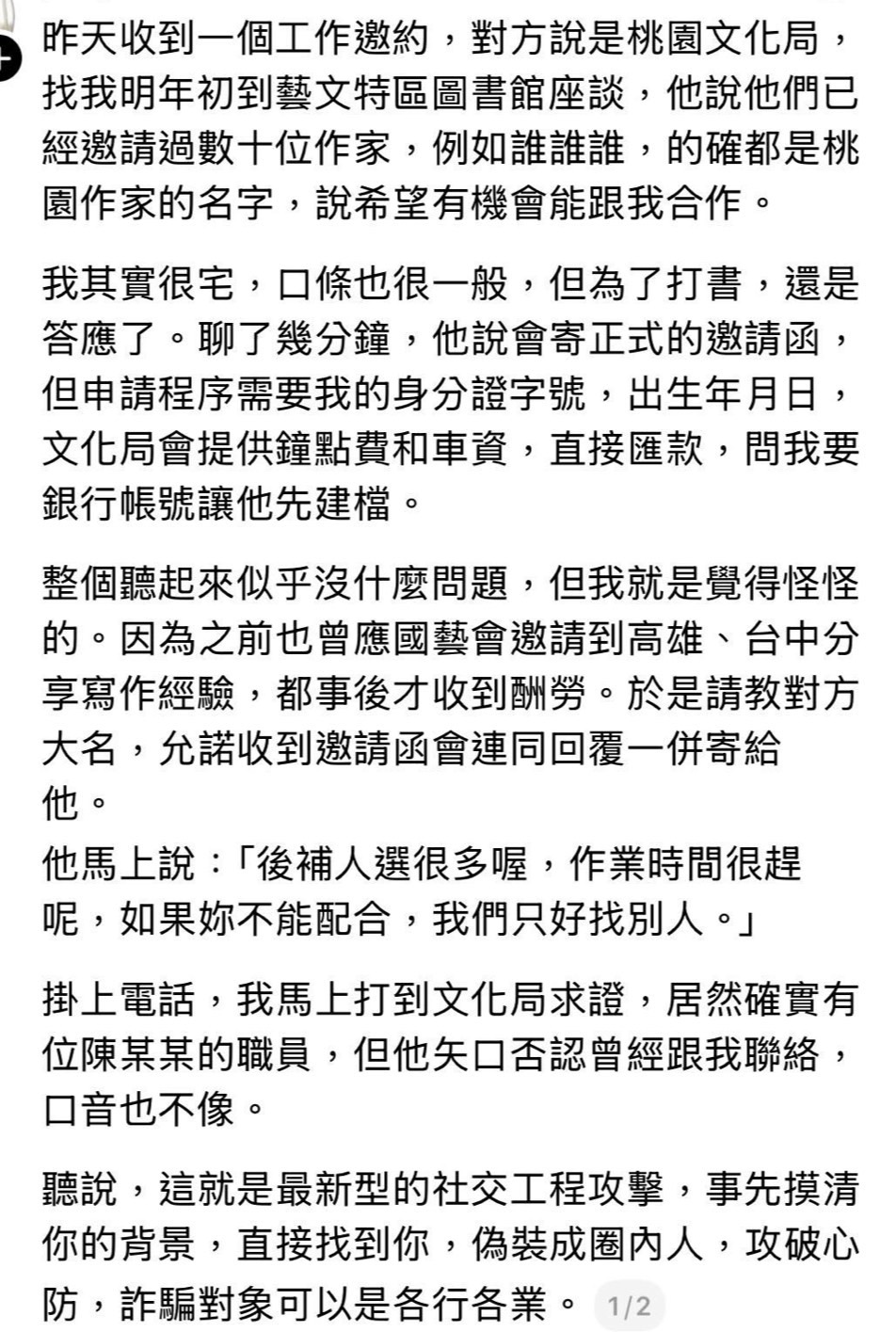 近期有民眾於 Threads 平台反映,有人疑似冒用「桃園市政府文化局」名義邀約講座,藉機詐取個資的情形。