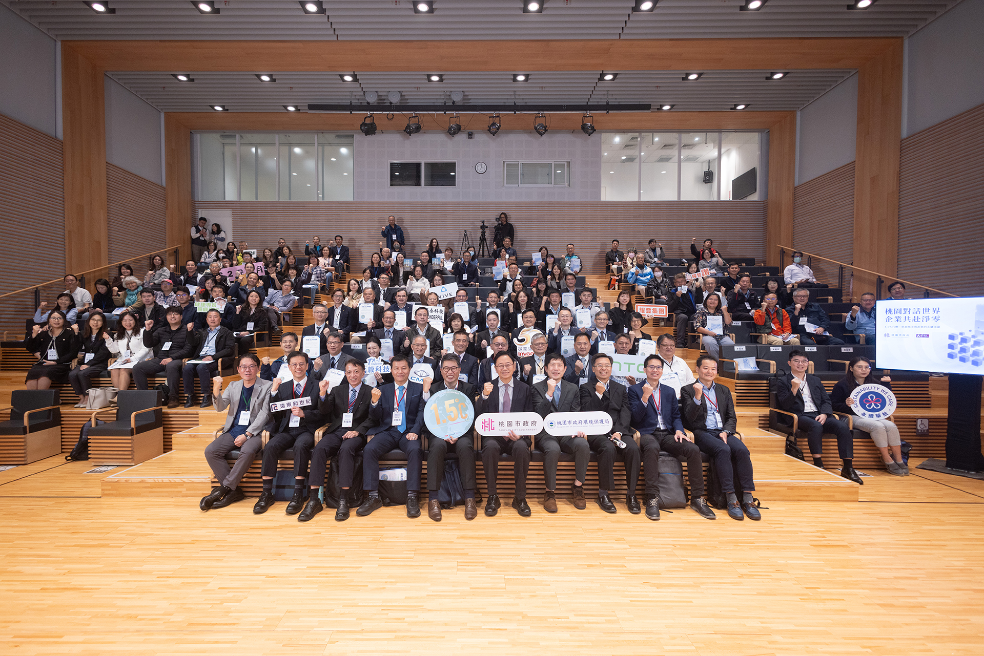 桃園市環保局18日在桃園市立圖書館總館舉辦「桃園企業 1.5°C 論壇暨授證儀式」張善政市長也親自出席授證儀式,表揚包含鴻海精密、遠東新世紀、躍登科技等32家企業,張市長肯定在地企業推動減碳、能源轉型及碳管理制度化,展現對全球升溫不超過 1.5°C 的行動承諾。