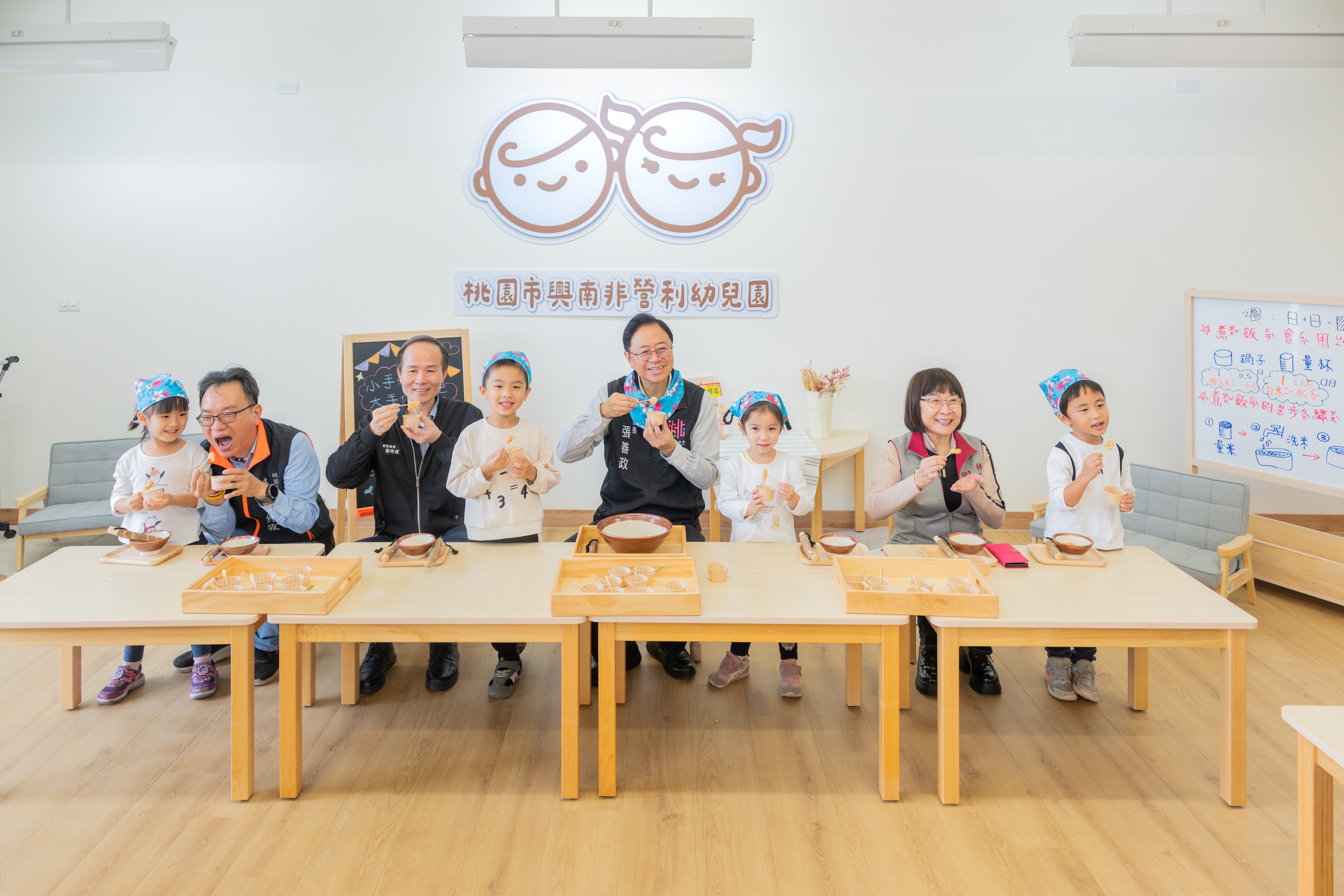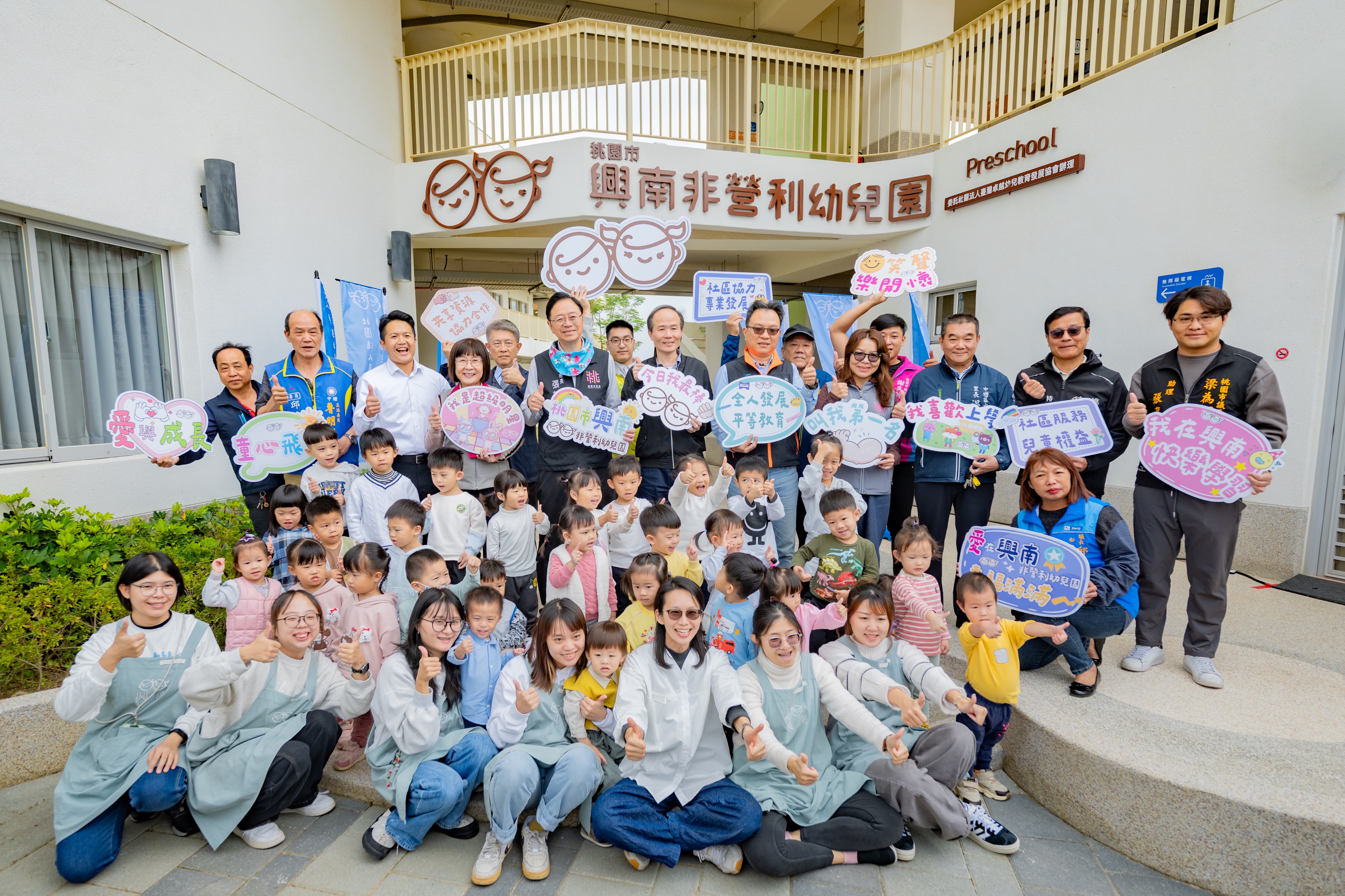 張市長說明,興南非營利幼兒園共設6個班級,其中4班為兩歲專班、2班為混齡班,可有效滿足中壢地區年輕家庭快速增加的托育需求。張市長指出,桃園整體幼托需求仍持續上升,114學年度全市兩歲專班已達200班,其中123班為近3年新增,顯示桃園在少子化趨勢下仍維持相對穩定的生育力,也反映市府在托育政策上的成果。