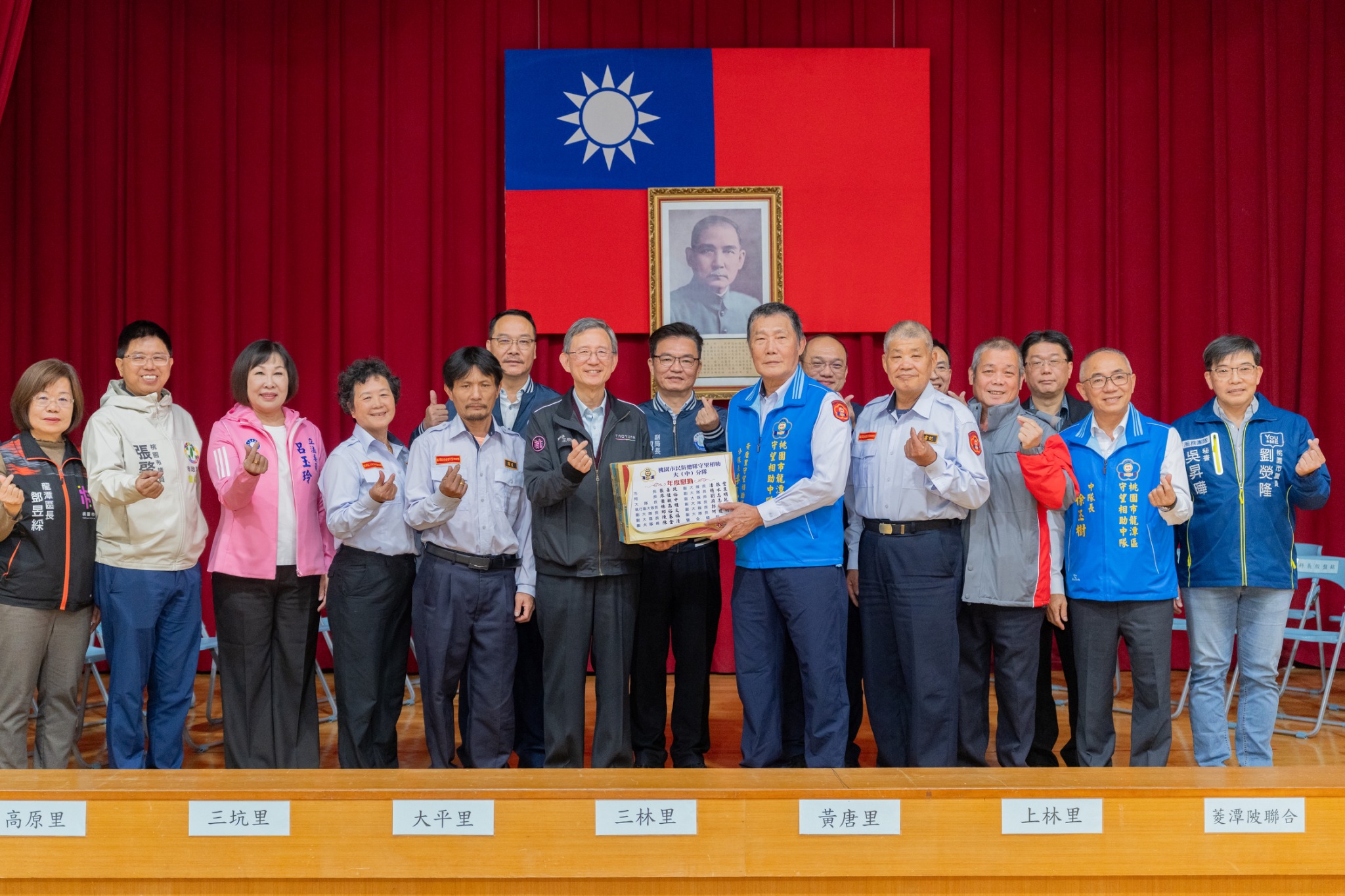 今日包括立法委員呂玉玲、市議員暨守望相助大隊龍潭中隊長徐玉樹、市議員張肇良、市府警察局副局長鄭榮崑、龍潭區長鄧昱綵、桃園市守望相助大隊大隊長蕭毓中等均一同出席。