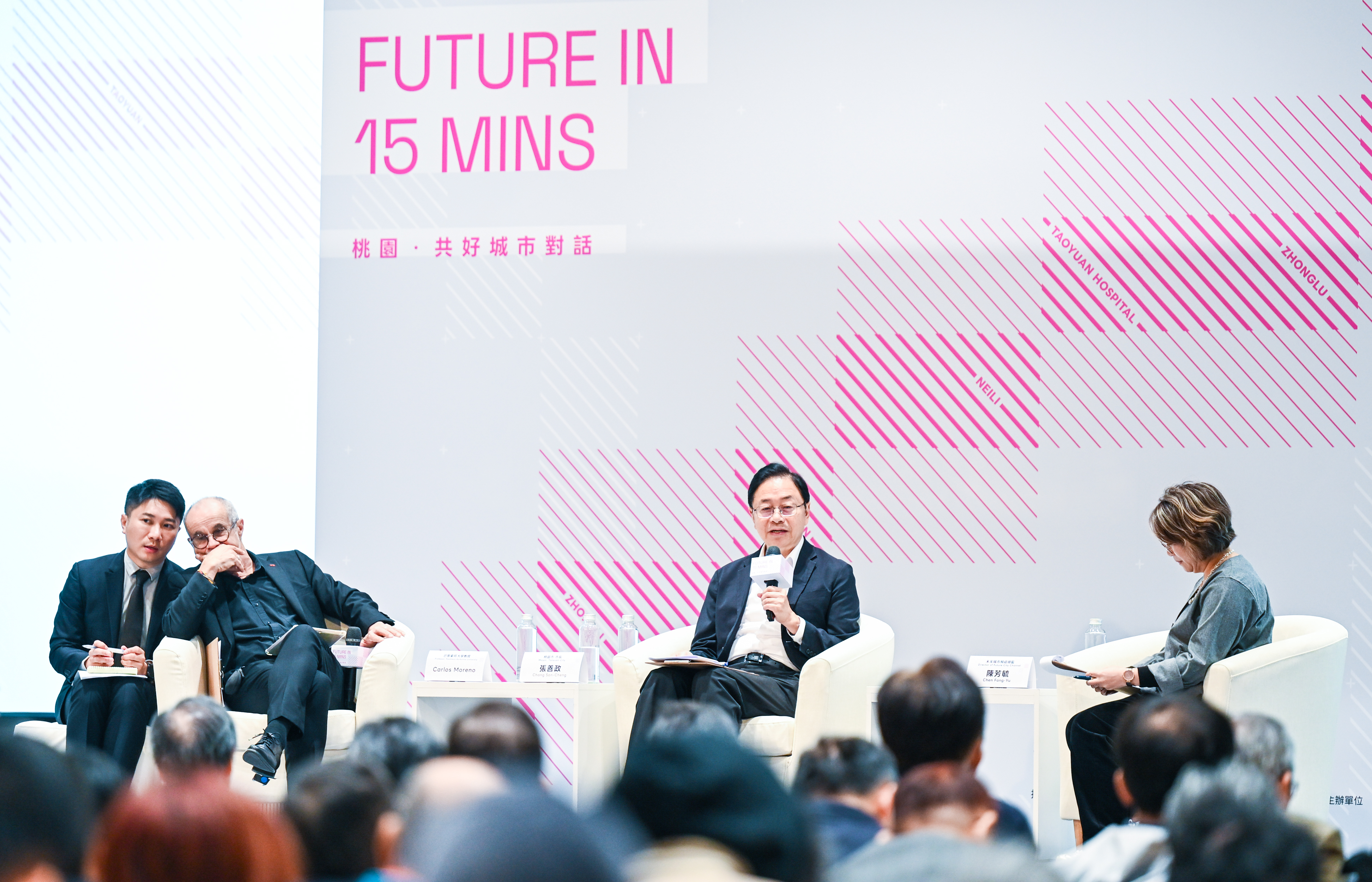 論壇中,張市長與巴黎索邦大學教授Carlos Moreno交流桃園落實「15分鐘城市」的機會與挑戰。張市長表示,桃園長期承接雙北通勤人口,各區發展脈絡不同,要全面達成15分鐘生活圈具高度挑戰,因此市府將從就業、教育、醫療三面向打造多核心生活圈;包括創造更多在地就業機會、加速布建托育與教學設施、完善通學步道與通勤路網,以及透過市立醫院分院普及醫療資源。