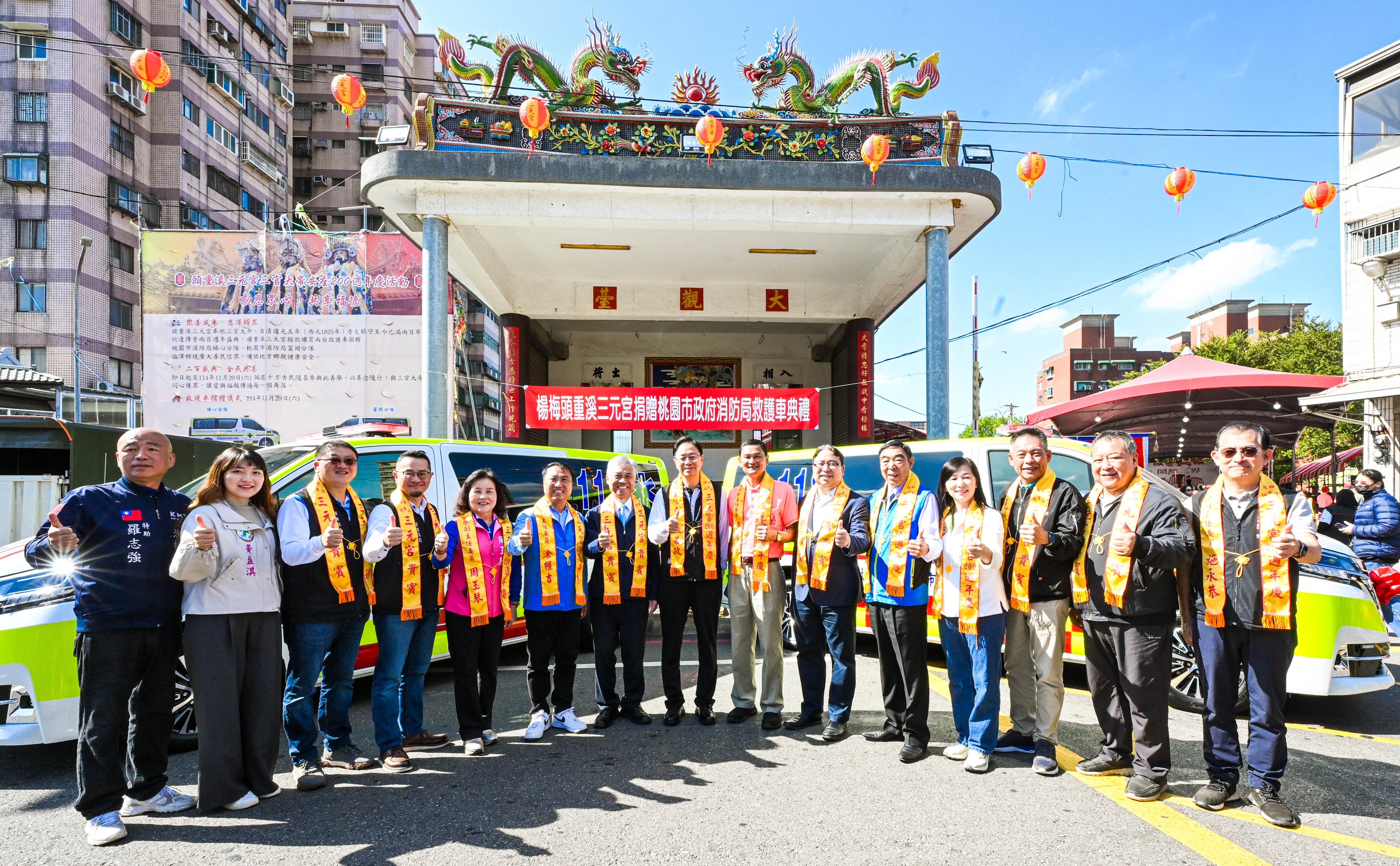 張市長也特別感謝頭重溪三元宮主委吳錦鴻長期投入公益,此次三元宮更捐贈楊梅埔心分隊及富岡分隊兩部全新救護車,協助市府強化救護量能,為在地鄉親提供更即時、完善的緊急醫療後送服務。