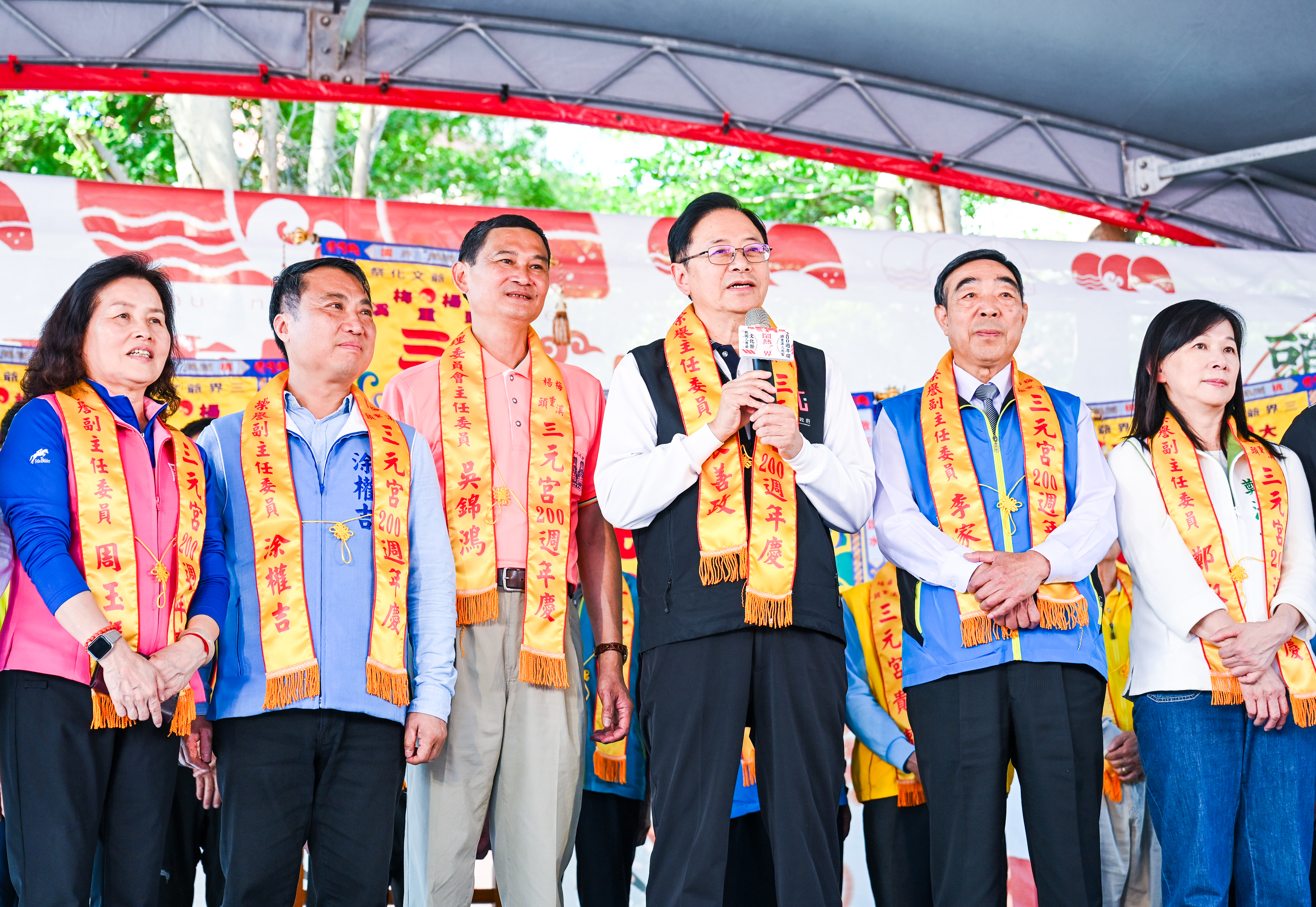 今日包括立法委員涂權吉、市議員周玉琴、李家興、鄭淑方、總統府副秘書長何志偉、客家委員會副主委范佐銘、法務部次長黃世杰、市府客家局長范姜泰基、民政局長劉思遠、消防局長龔永信、農業局長陳冠義、楊梅區長施永恭、中壢區長李日強、平鎮區長蕭巧如、頭重溪三元宮主委吳錦鴻、興元宮總幹事莊訓庚等均一同出席。