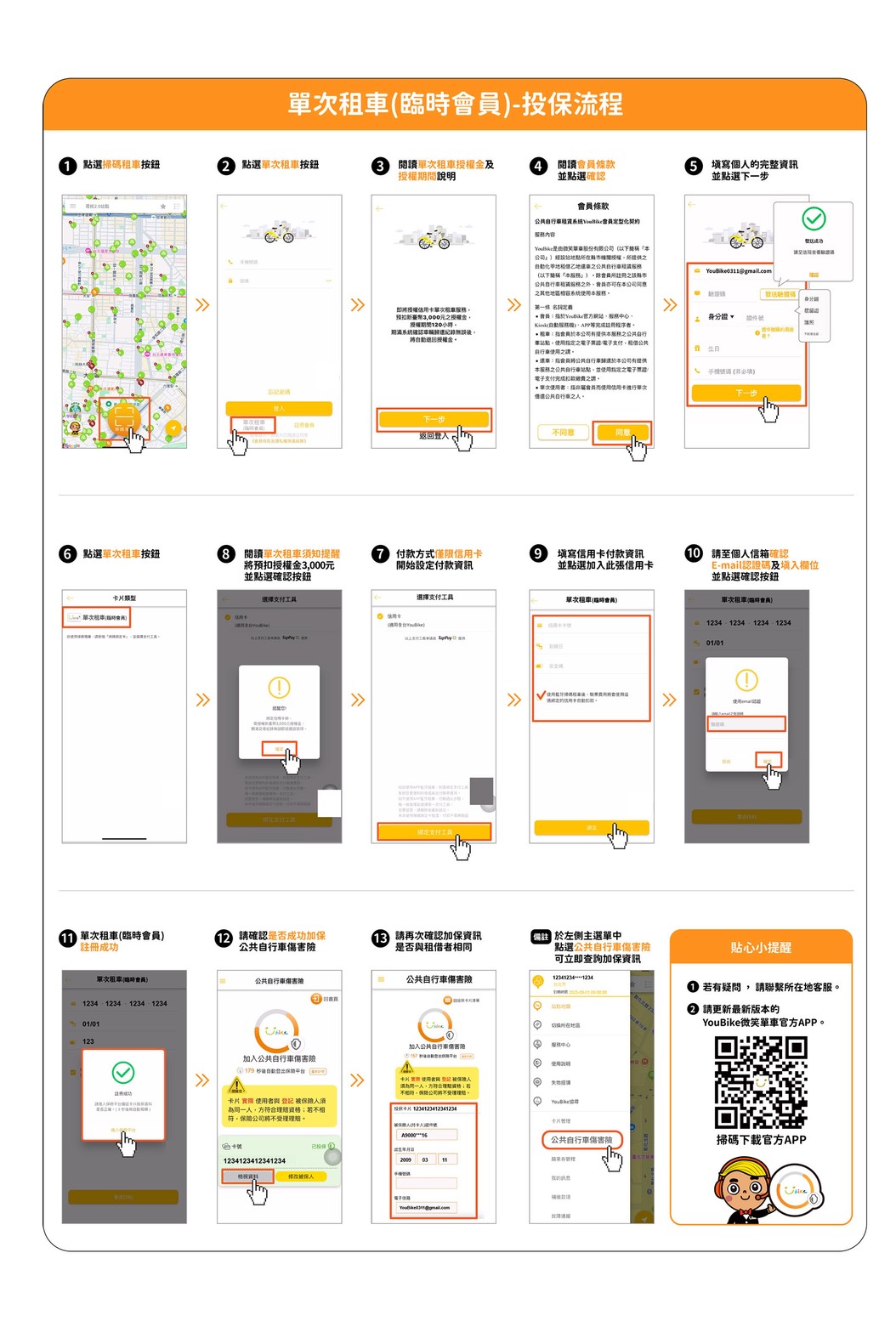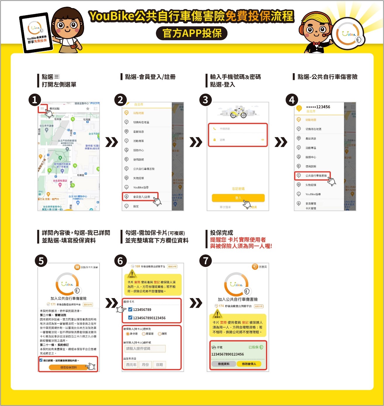 交通局提醒,會員必須以「本人登錄的卡片」租借公共自行車,方能享有保險保障,市民可至 YouBike 官方網站或 APP「公共自行車傷害險」專區免費投保並查詢投保狀況,操作簡單迅速。呼籲尚未投保的民眾儘速完成資料填寫,以免新制上路後因未投保而無法租借,影響使用權益。