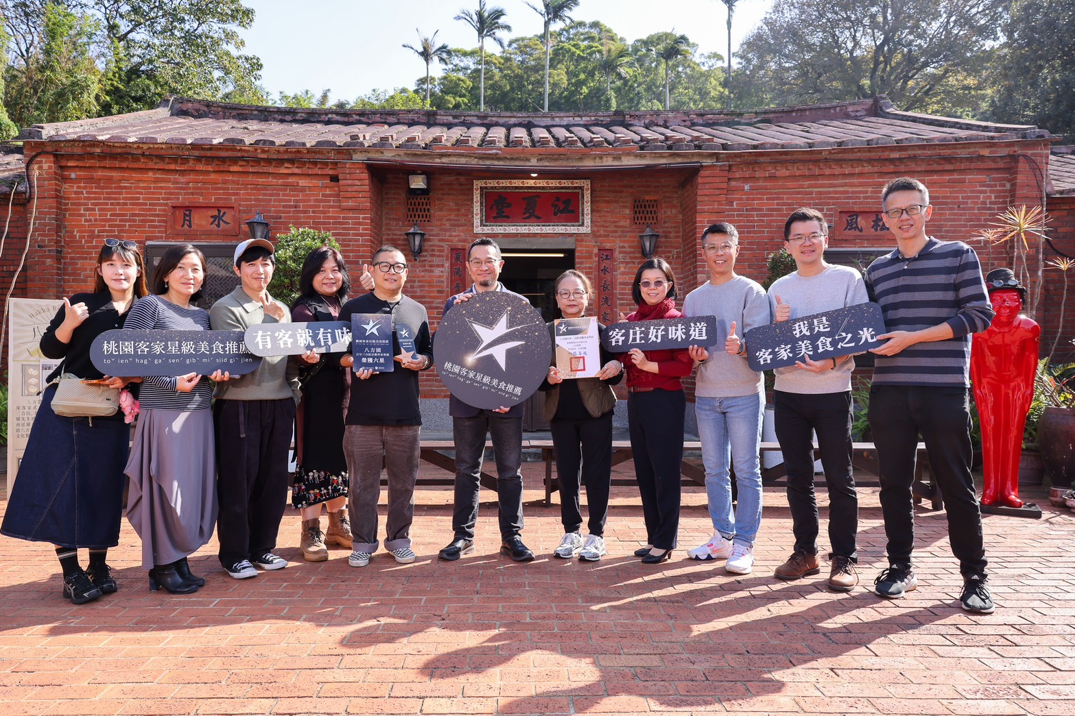 延續上個月剛公布「桃園客家星級美食推薦」名單的熱度,桃園市政府客家事務局局長范姜泰基今(16)日前往今年唯一榮獲六星推薦的八方園百年三合院景觀客家餐廳致贈客家星級美食推薦六星立牌與獎狀,肯定店家在客家傳統手路菜、風味創新與文化推廣的深厚實力。