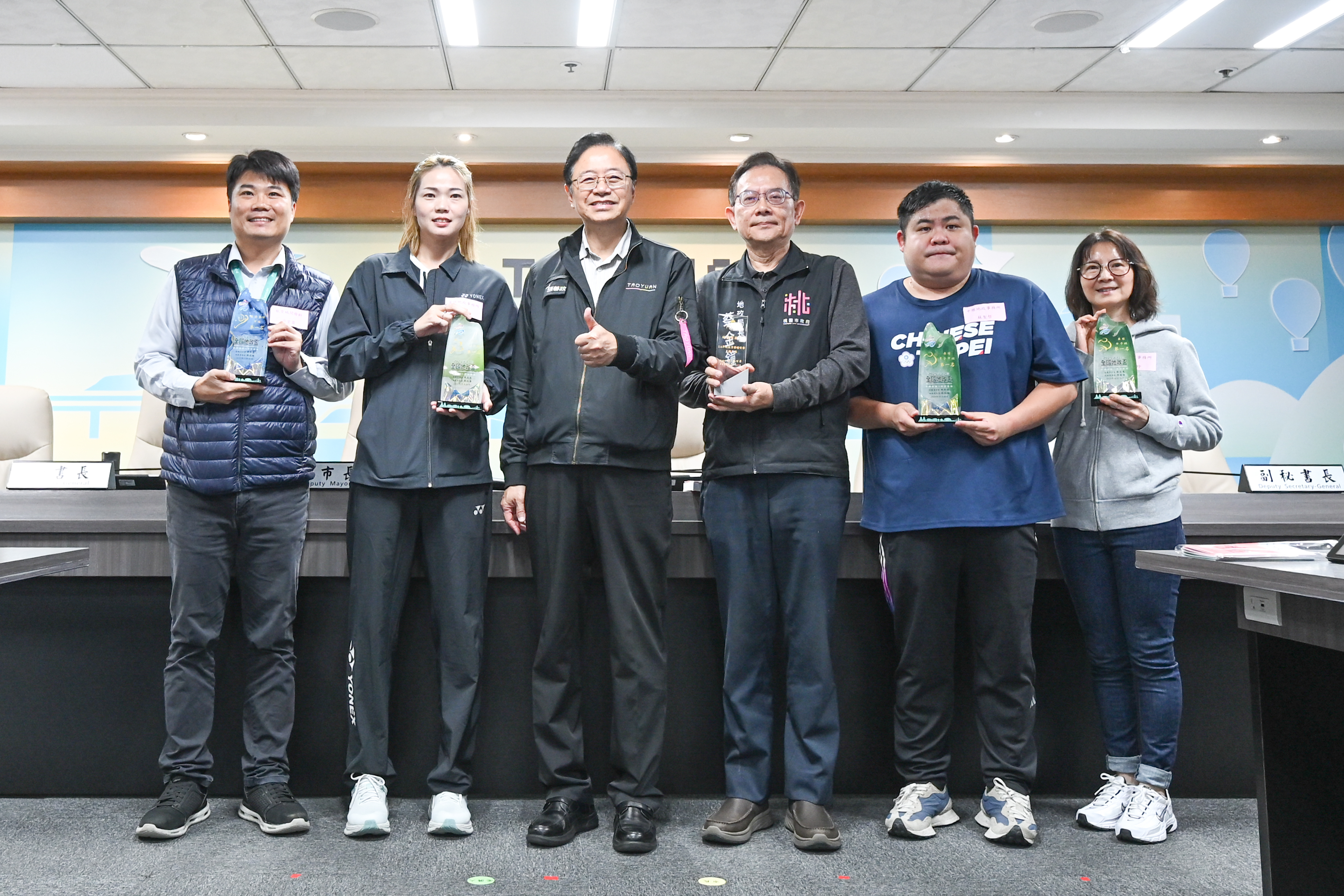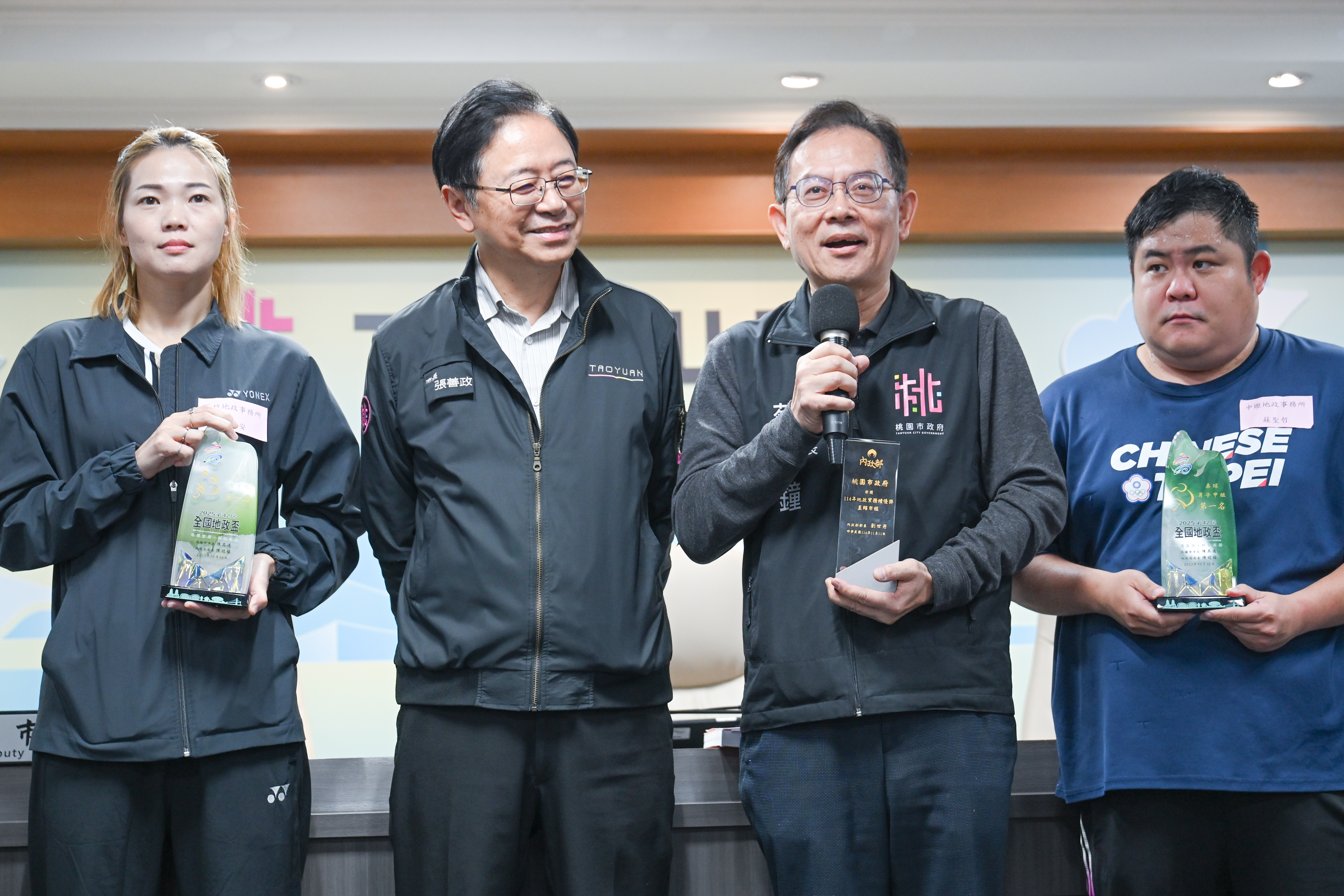 地政局長蔡金鐘表示,地政業務繁重,局內仍鼓勵同仁於公務之餘培養運動習慣,強健體魄、紓解壓力,並透過競賽凝聚向心力、深化團隊合作精神。今(114)年除榮獲內政部114年地政業務督導總考評「績優獎」外,桃園地政團隊亦於全國地政盃競賽中表現亮眼,從全國產、官、學界55個參賽團體中脫穎而出,一舉拿下男子桌球團體賽甲組、女子桌球團體賽、女子羽球團體賽及慢速壘球團體賽甲組等4項冠軍。未來地政局將持續秉持文武兼備、團隊合作精神,以專業與責任感精進服務品質,提供市民更優質、便民的地政服務。