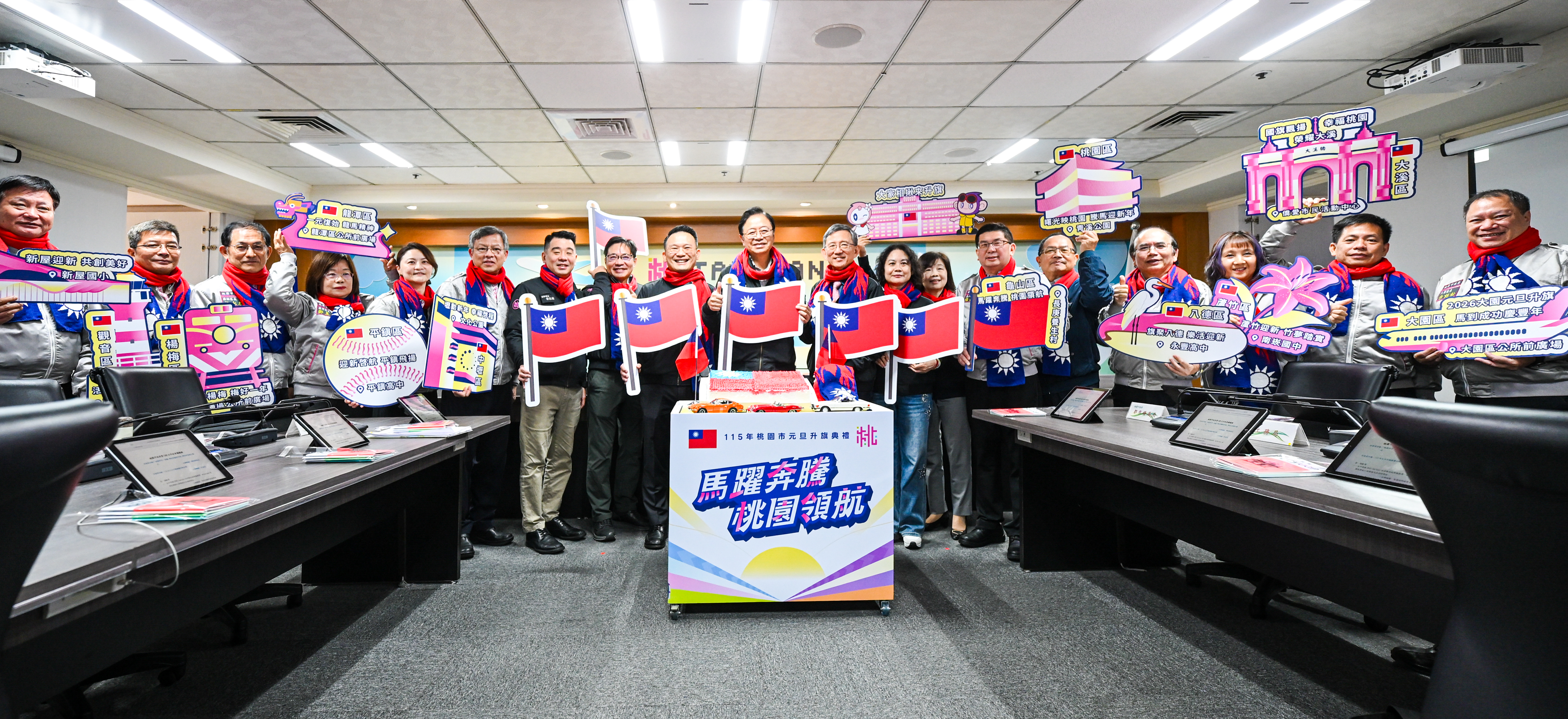 張市長指出,明年適逢馬年,升旗典禮以「馬躍奔騰.桃園領航」為主題,象徵桃園持續向前、勇於開創的城市精神。本次典禮活動內容豐富,特別邀請知名歌手施孝榮及陸軍專科學校戰鼓隊,擔任表演嘉賓,並由「桃園合唱劇工坊」領唱國歌,陸軍二一砲指部將協助拉展大型國旗,同時活動也結合樂天女孩精彩演出,為典禮增添活力。另外,為響應市府致力推動的「靜桃計畫」,環保局特別號召古董車友組成示範車隊,在活動現場展示古董車優雅風采與環境保護理念。