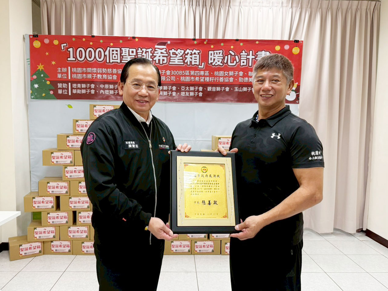 由桃園市關懷弱勢慈善協會與桃園市親子教育協會主辦的「聖誕希望箱・暖心計畫」,於 12 月 18 日舉行捐贈暨感謝儀式。活動中,宣布本次共募集 500 箱聖誕希望箱,由 桃園市政府社會局 陳寶民局長代表受贈,並將分送至桃園市各地「小衛星據點」弱勢兒少手中。