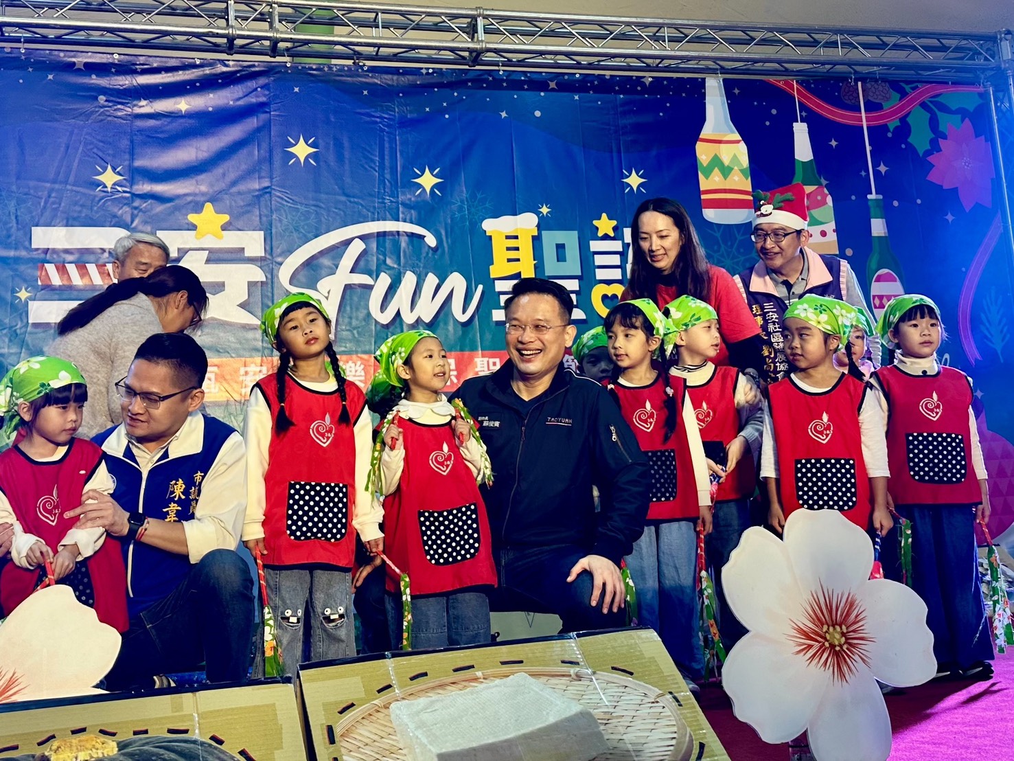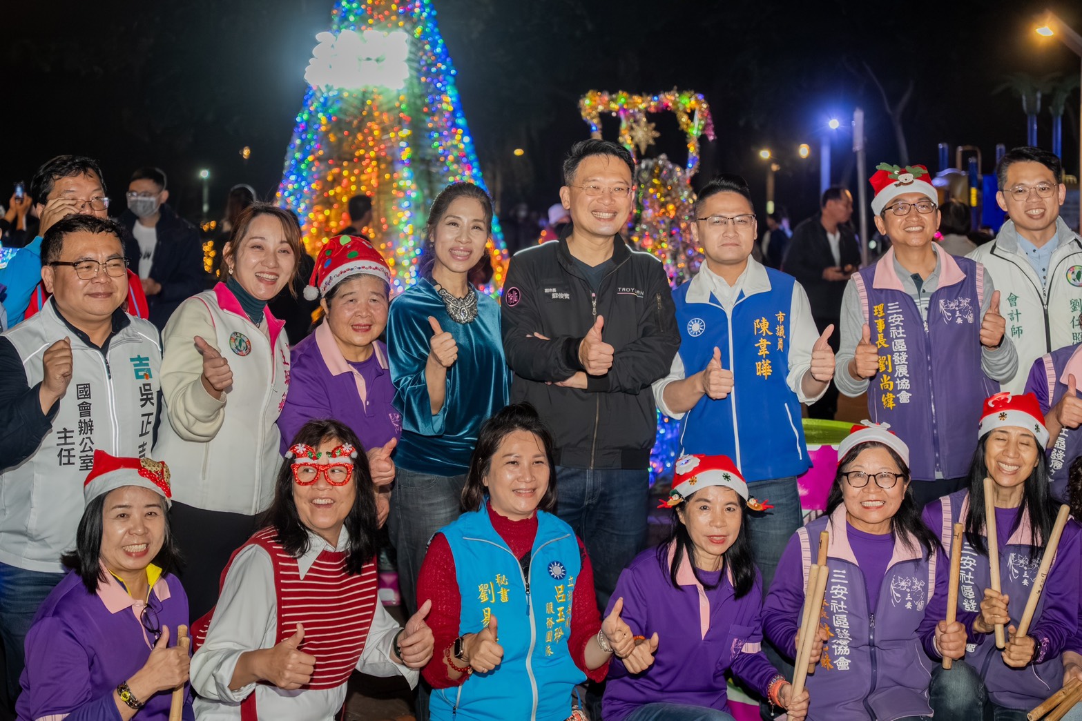 蘇俊賓指出,今年活動最吸睛的聖誕樹,是由社區志工跨里合作、收集近1,500支廢棄玻璃瓶打造而成。早在11月初,他已偕同舒翠玲、陳韋曄議員與三安社區發展協會的里長及志工們共同清洗玻璃瓶並組裝環保聖誕樹,在社區夥伴的努力之下,今天順利點燈,蘇俊賓表示,這不僅是美學的呈現,更是環保意識的具體實踐,讓廢棄物轉化為點燈儀式中最閃耀的藝術品,賦予資源第二生命。