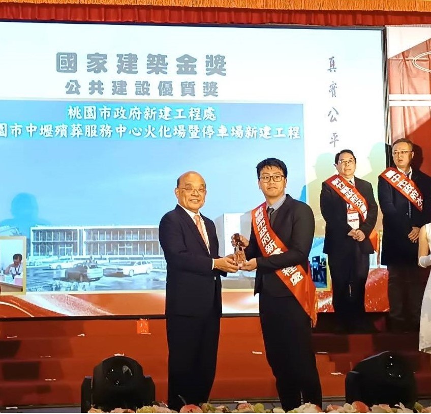 台灣永續關懷協會長年推動建築品質與工程誠信,辦理「國家建築金獎」甄選活動,表揚全國優良營建團隊與健康建築典範。今年(114)第26屆評選中,新建工程處承辦的「中壢區殯葬服務中心火化場新建工程」榮獲「公共建設優質獎/規劃設計類」、「公共建設優質獎-首獎」及「評審團特別獎」等大獎,展現桃園在公共工程品質管理上的卓越成果,更是對工程團隊專業與品質堅持的肯定。新工處將持續秉持嚴謹與創新精神,精進施工與設計品質,打造更多兼具功能、安全與人文意象的優質公共建設,持續推動桃園工程品質邁向卓越。