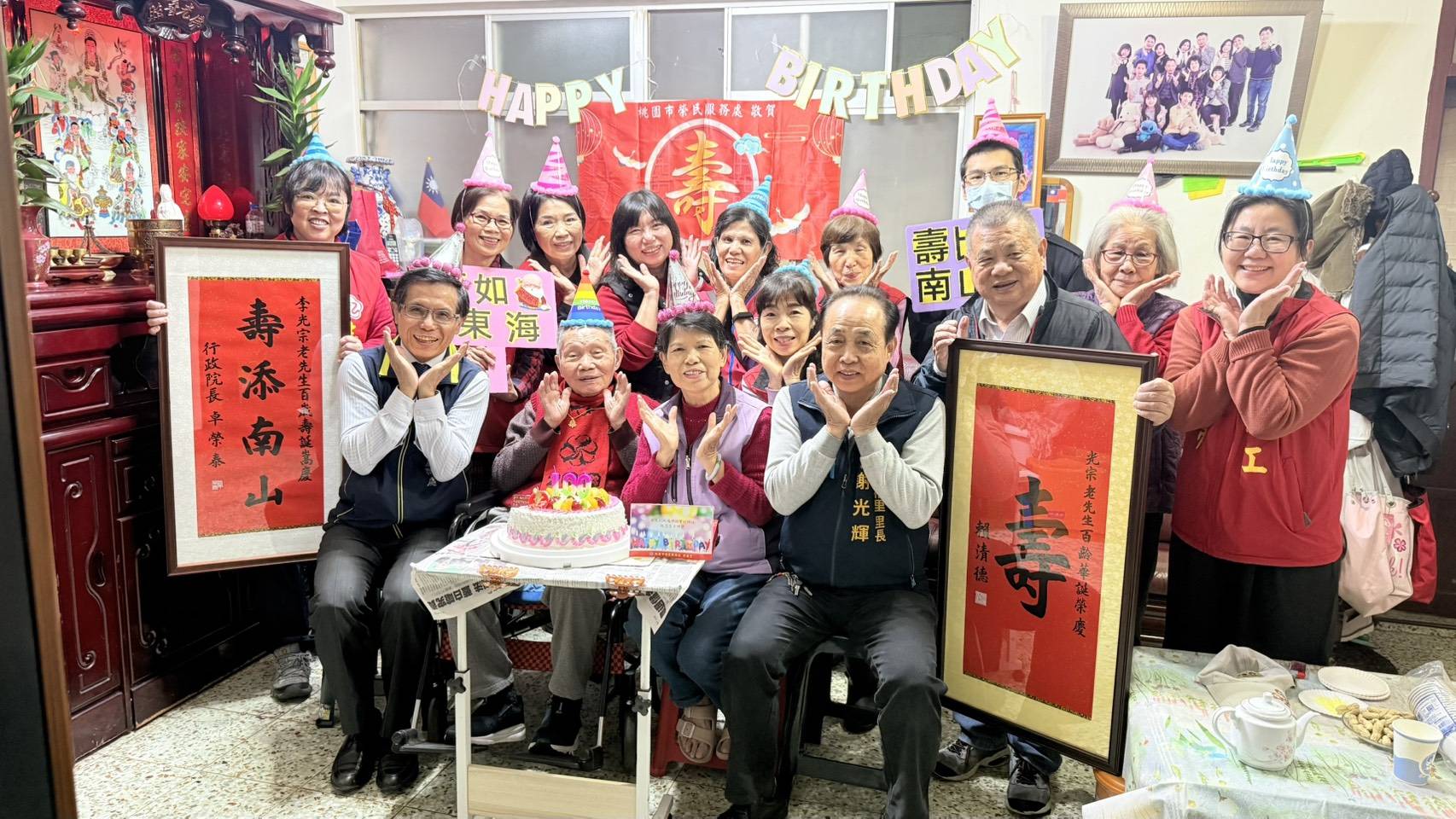 為表達對百歲榮民的崇高敬意與關懷,適逢歲末年終、迎接新年之際,桃園榮民服務處於12月31日,由鄭源敏處長親率責任區輔導員、社區服務組長及榮欣志工團隊,前往李伯伯住家辦理百歲壽誕祝壽活動,並特別邀請忠福里謝光輝里長共襄盛舉,在跨年前夕提前為即將於1月4日迎來百歲生日的李伯伯獻上最誠摯的祝福,現場洋溢溫馨隆重、辭舊迎新的感動氛圍。
