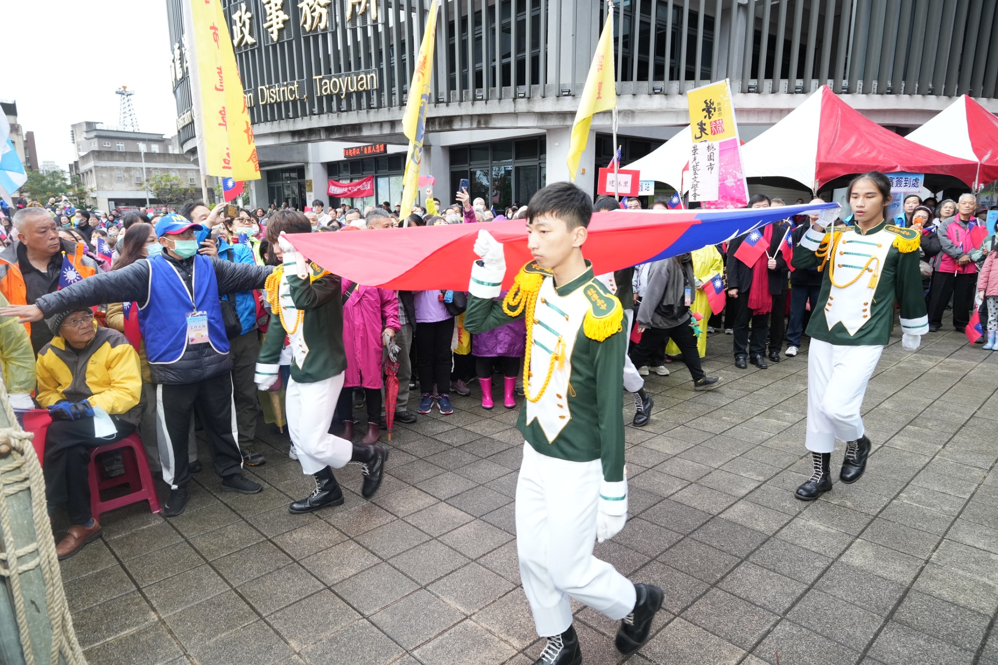 龍潭115年元旦升旗典禮,雖天氣寒冷、時而飄下細雨,但不減民眾參與熱情,估計在廣場上的市民超過1,000人。龍潭區公所有特別準備小國旗、國旗護腕、小熊毛巾供民眾領取,藉此小禮物傳遞誠摯的新年祝福,希望大家在新的一年裡幸福安康。