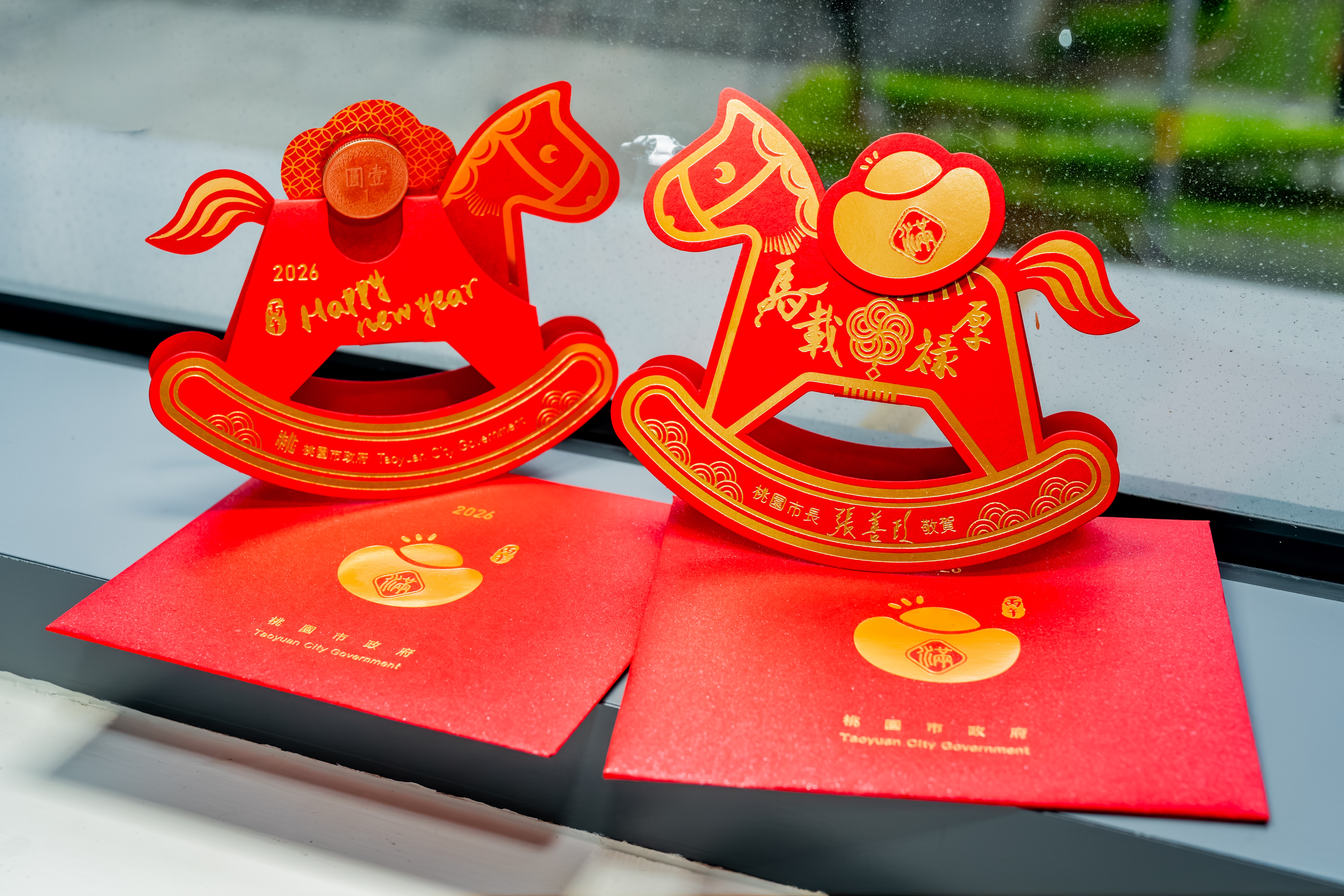 張市長說明,今年春聯共推出兩款設計,其中「馬載祿厚」取閩南語諧音「明仔載愈好」,象徵來年福祿滿載、運勢亨通;「馬吉來」則與桃園市議會議長邱奕勝聯名,諧音寓意「好朋友(麻吉)來」、「福氣來」,傳遞迎新納福的美好祝願。此外,今年同步推出結合童趣設計的「元氣搖搖馬」福袋與立體紅包袋,盼讓大、小朋友都能在過年期間,感受到濃厚的新春歡樂氣氛。