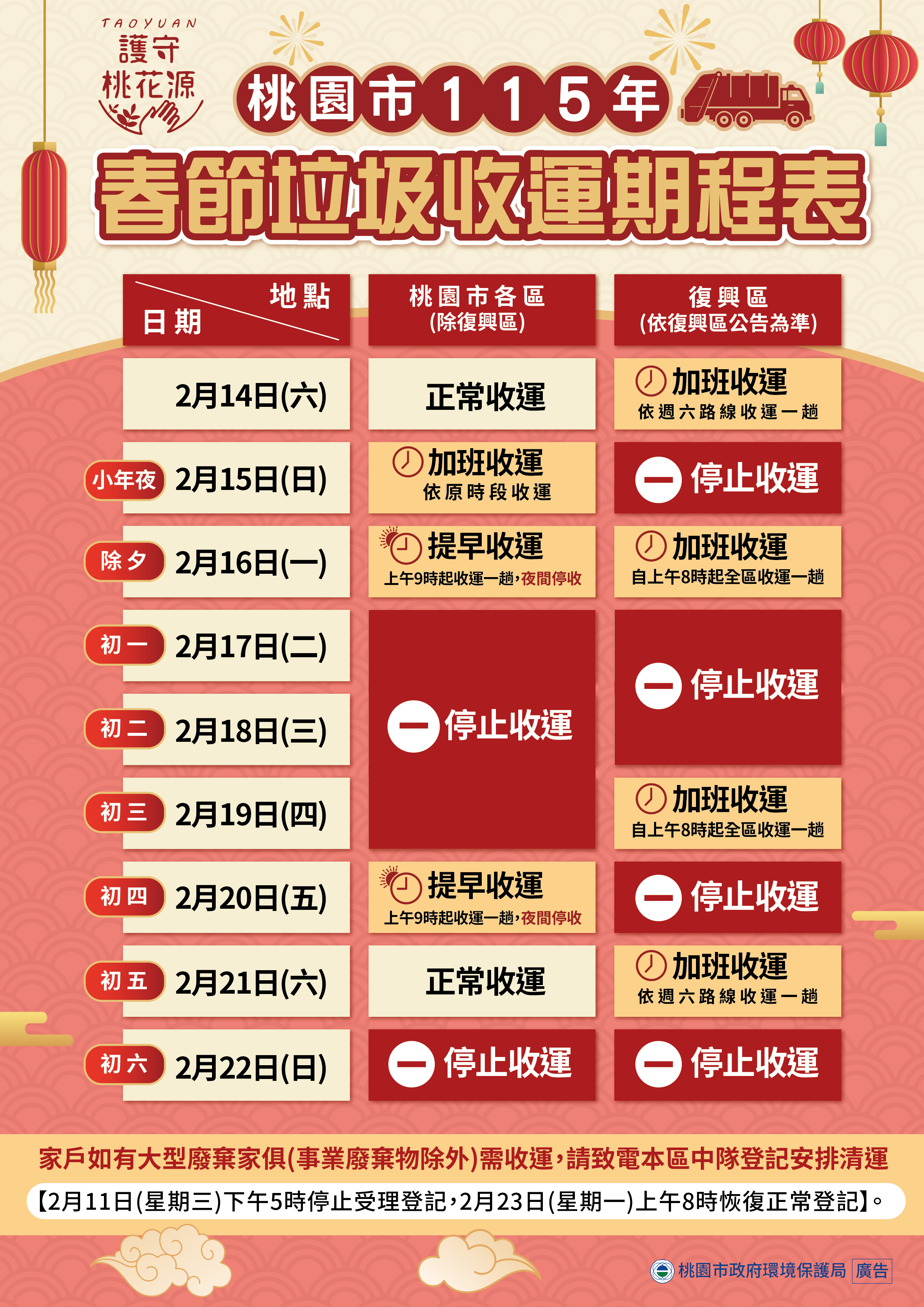 環保局補充,春節期間最新、最即時的垃圾收運資訊,可透過「桃園垃圾車APP」及環保局官網查詢,並也會透過官方臉書、報紙、廣播、家戶傳單及垃圾車懸掛紅布條等多元管道加強宣導,協助市民輕鬆掌握收運時程,安心過好年。