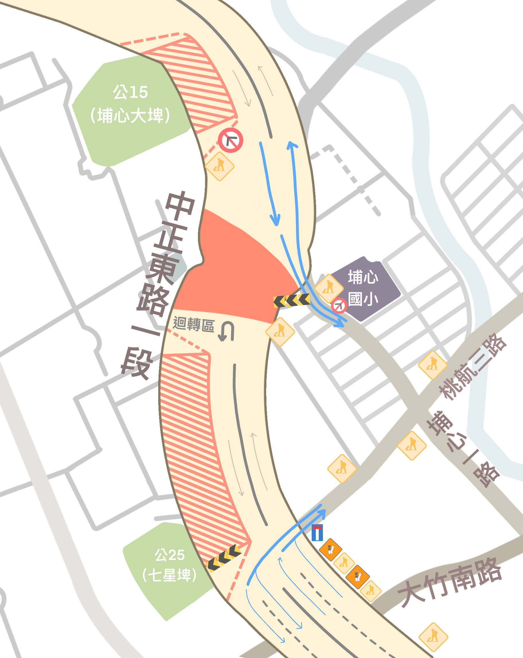本次施工係為辦理1-1-60M(航空城大道)尚未完成之排水箱涵工程,將既有下水道系統向上游延伸約180公尺,以改善埔心100-21號一帶過往易淹水問題。配合道路全線封閉措施,考量車輛轉向視距及路口平均延滯情形,中正東路與埔心街路口將實施禁止左轉管制,並於上游路段提前設置告示牌面,同時施工前經與地方議員、里長及相關單位溝通協調,於施工區周邊預留在地居民進出通道,維持日常通行需求。