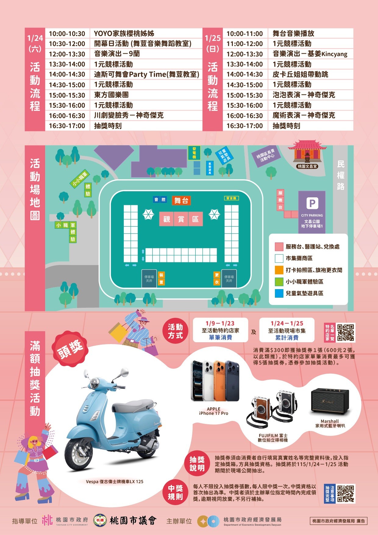 農曆春節將屆,「買年貨來桃園」系列活動,將於115年1月24日、25日在本市桃園區文昌公園舉行「舊城新浪漫:老城新春篇」首波活動,共規劃50個特色攤位,販售傳統食品、在地老店商品、伴手禮、甜點、飲品、文創商品與節慶美食等。為維護本市市民消費權益,桃園市政府法務局消保官(下稱消保官)將聯合桃園市政府經濟發展局及桃園市政府衛生局人員,在現場為民眾消費權益把關。