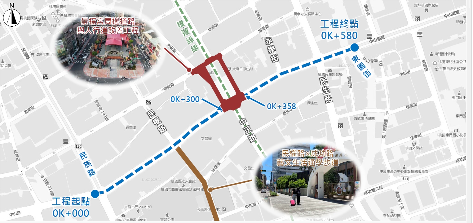 為實踐以人為核心、建立舒適的永續交通環境,養工處預計改善桃園區中山路(民族路~朝陽街)的人行環境,結合都發局辦理的景福宮周邊道路與人行道改善工程及養工處辦理的民權路與成功路口藝文生活通學步道,以提升其周邊人行品質,創造步行友善的空間。