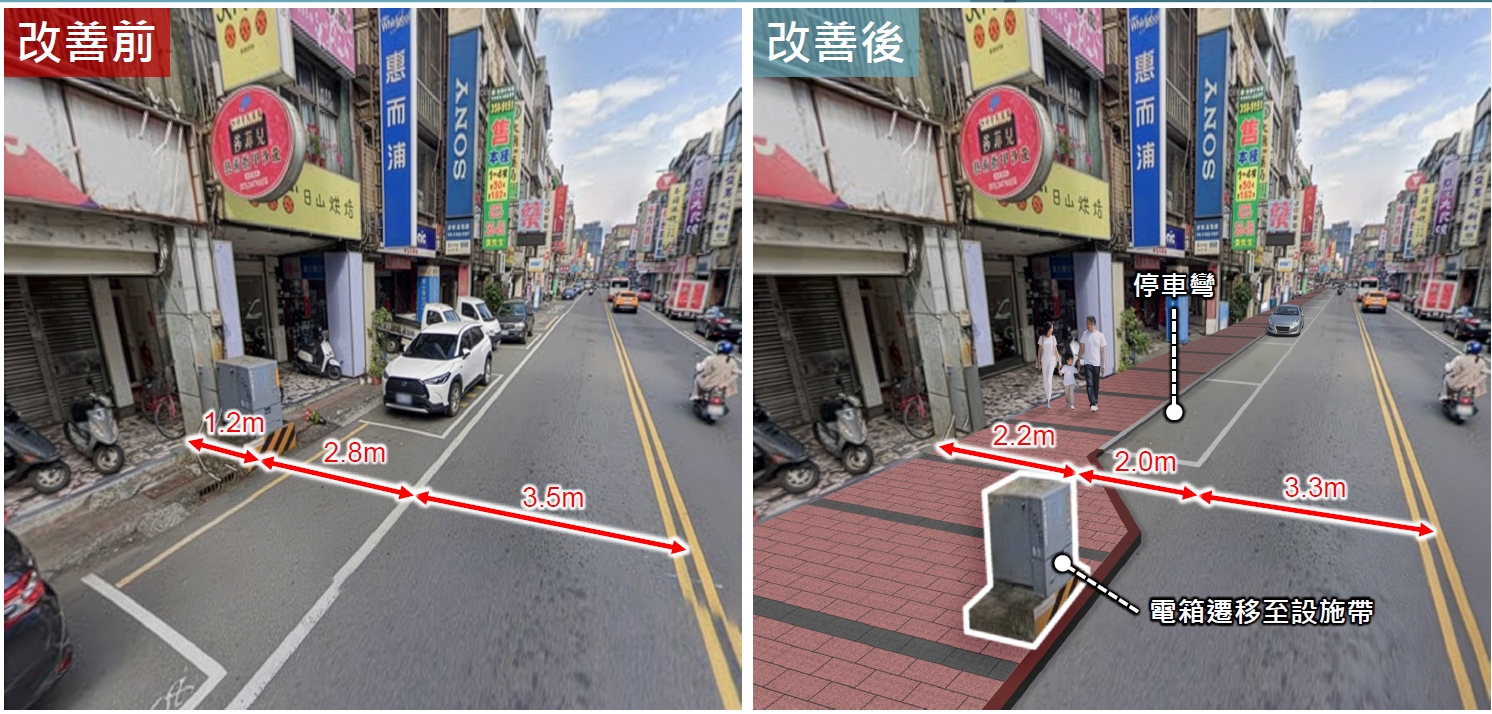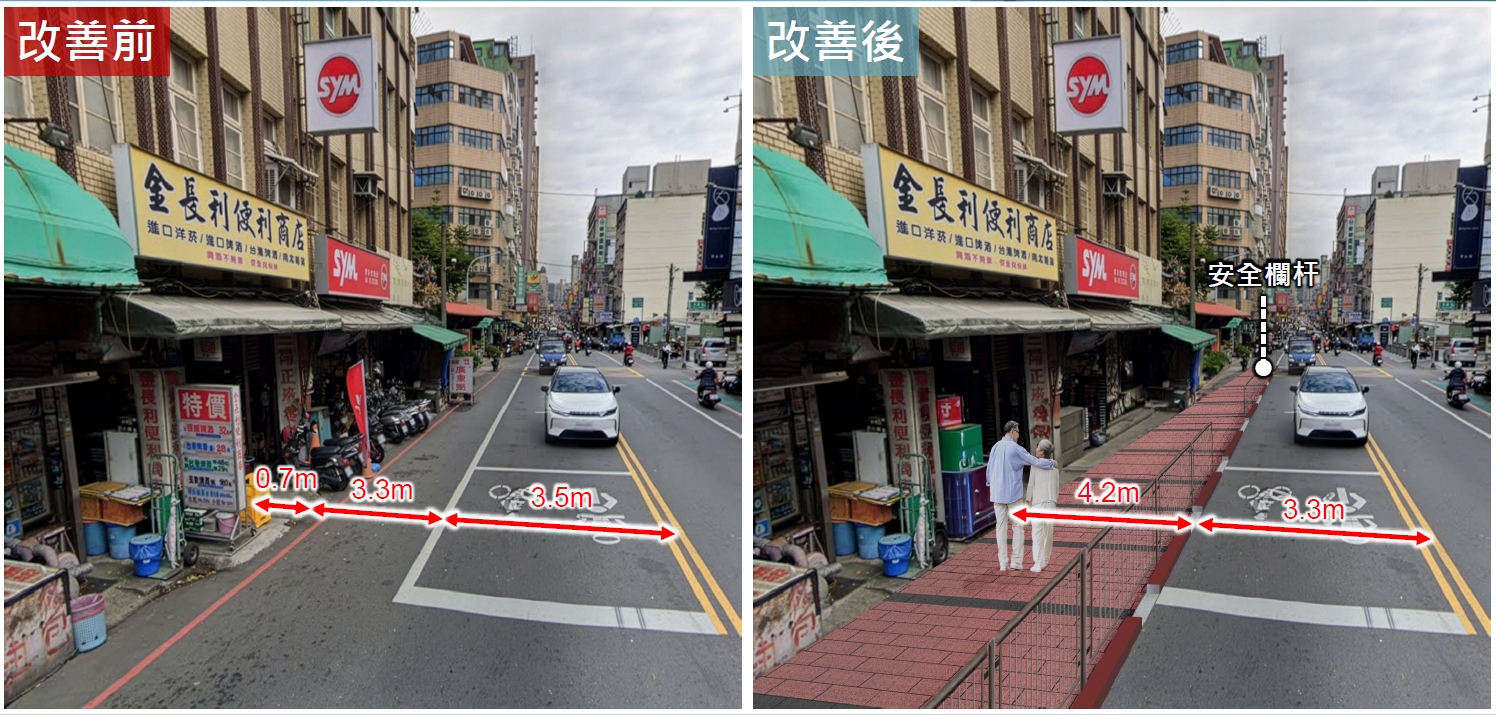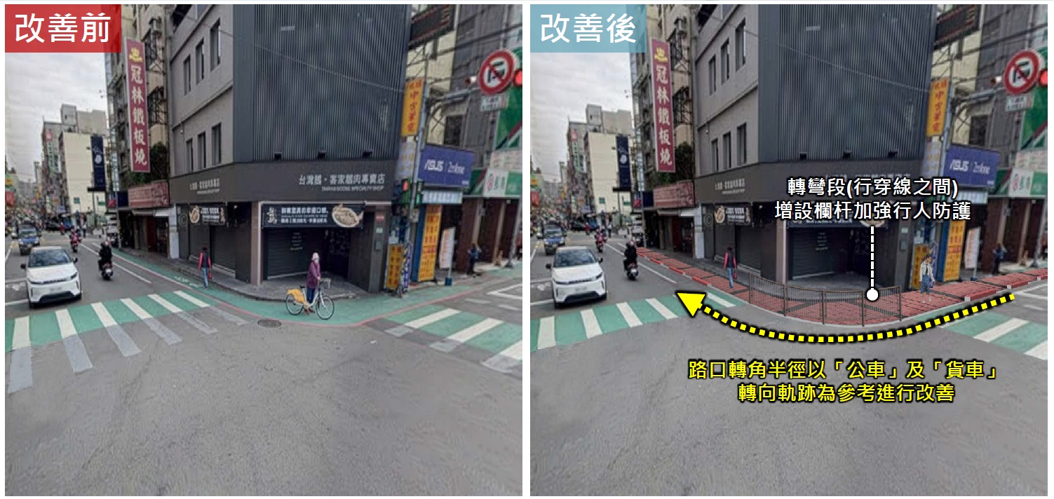 考量該路段範圍車流量高,在路口安全防護部分,則參考公車及貨車的轉向軌跡進行改善,並增設欄杆提升行人停等安全;團隊並觀察車輛使用習慣,以交叉路口10公尺內、車輛出入口左右延伸3公尺內、公車停靠區前後10公尺內、消防栓左右延伸5公尺內不劃設原則,少量減少汽車停車格自51格至38格、增加機車停車格自35格至99格,並保留無障礙汽車格及機車格不做數量更動。