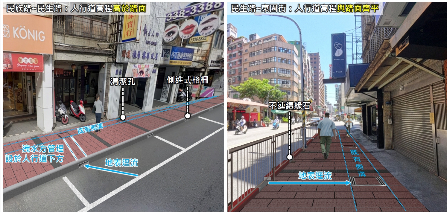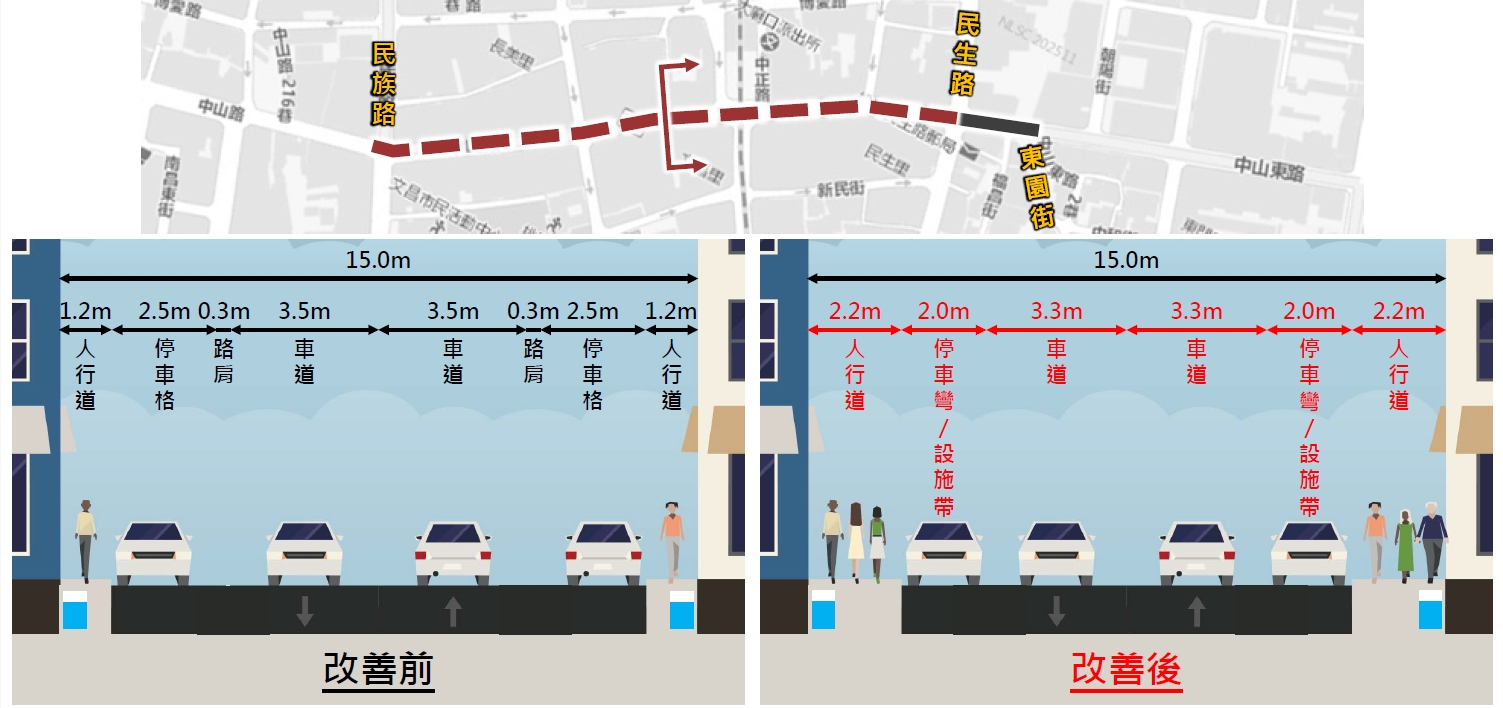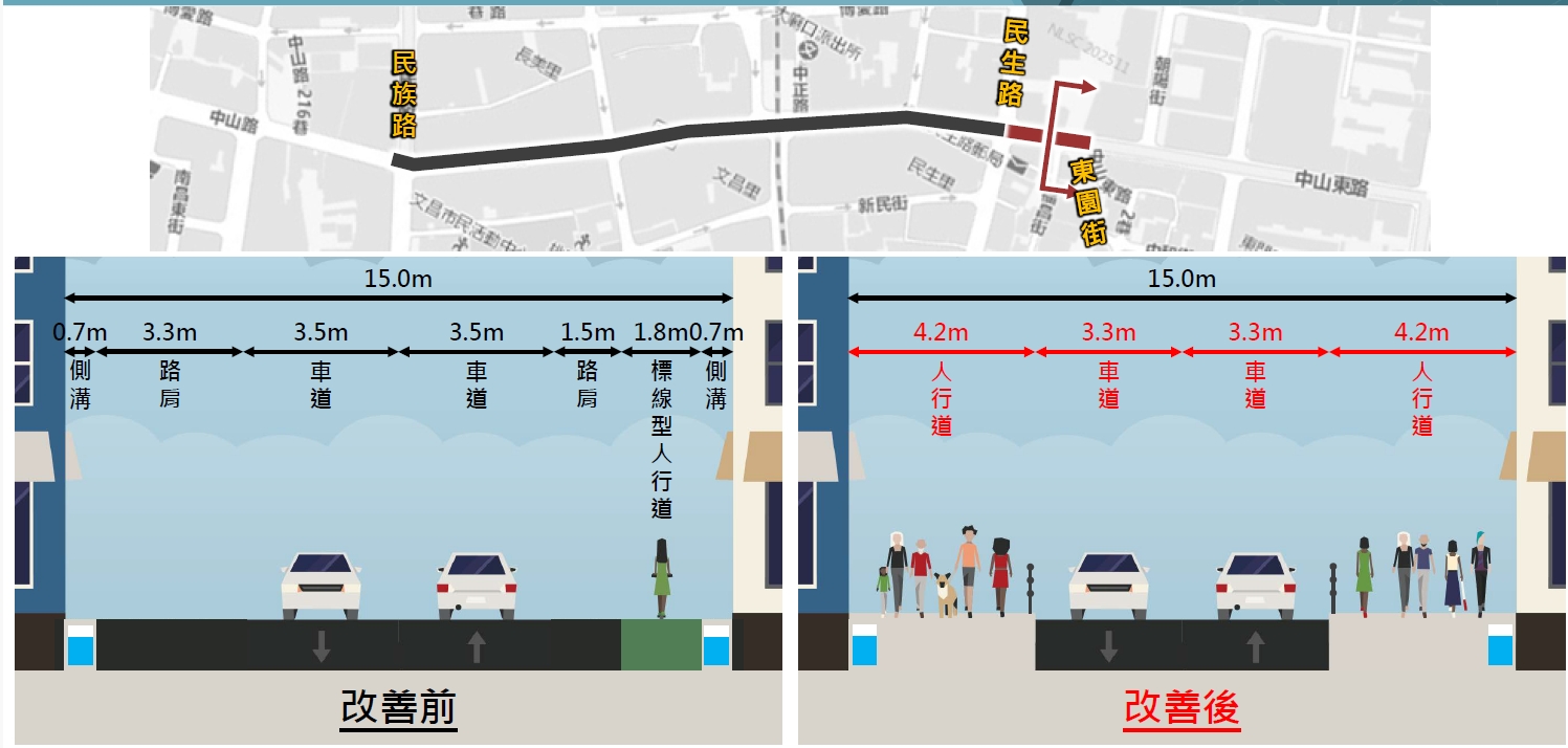 本工程改善長度約580公尺,現況有人行淨寬不足、私設斜坡道、佔用物、電箱、不合無障礙設計規範動線、無人行空間、無實體防護的現象,在民族路至民生路段,預計縮減車道淨寬,整合停車空間為停車彎及設施帶,並增加人行道淨寬等方式,改善人行環境及停車空間;在民生路至東園街段,整合標線型人行道、側溝、路肩並縮減車道淨寬,以增加實體人行道及安全欄杆,提供行人更實體的防護空間。