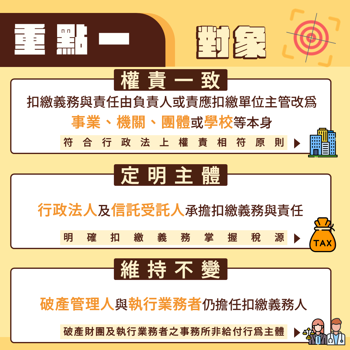 一、扣繳主體:事業、機關、團體、學校等給付薪資、利息及租賃等扣繳範圍之所得,原係由事業負責人、機關、團體或學校之責應扣繳單位主管等自然人擔任扣繳義務人,自114年1月1日起扣繳義務人變更為事業、機關、團體或學校本身,使權責相符。