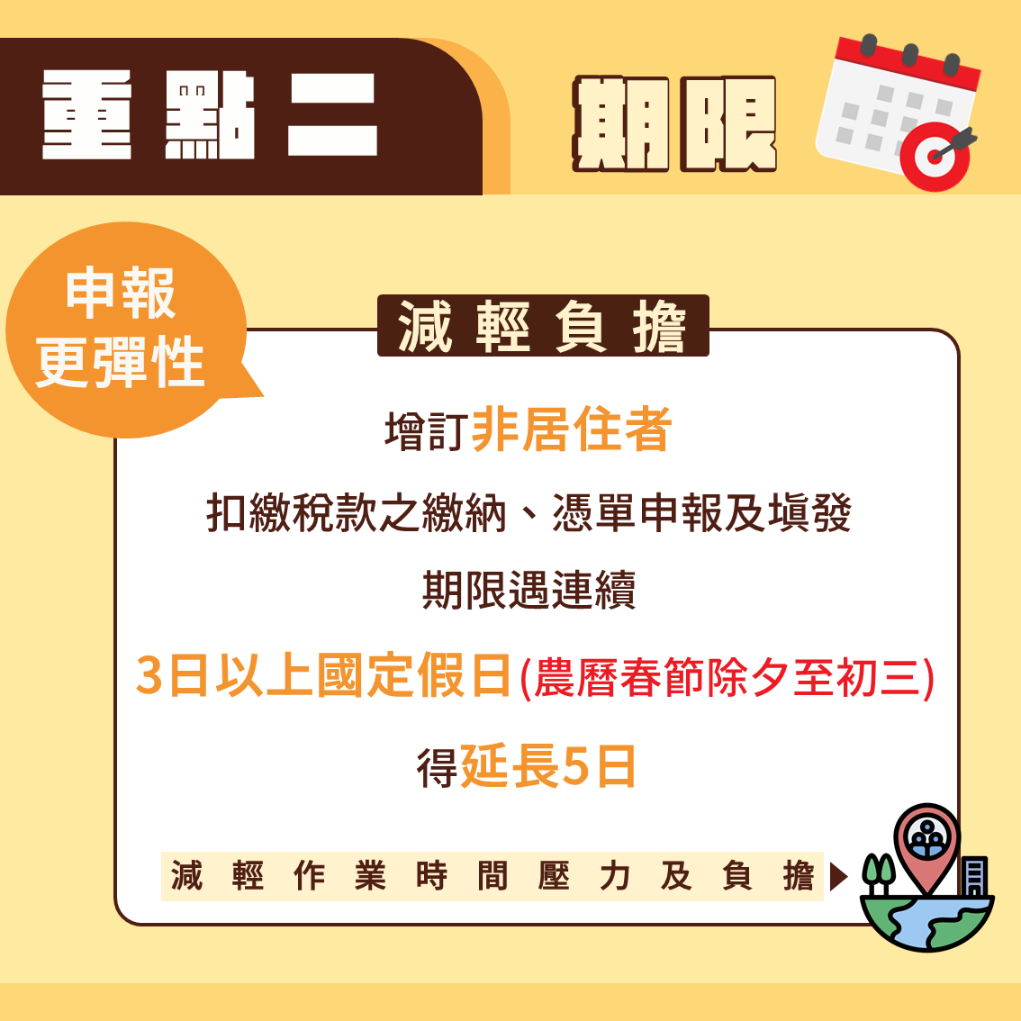 二、非居住者扣繳申報:給付非居住者代扣稅款之日起算10日內遇連續3日以上國定假日者,比照居住者扣繳時限彈性,所扣稅款繳納、扣繳憑單申報核驗及發給期間延長五日,該分局舉例說明,115年2月10日給付非居住者,原規定申報迄日至115年2月19日,因中間遇連續5天國定假日,故申報延長至115年2月24日。
