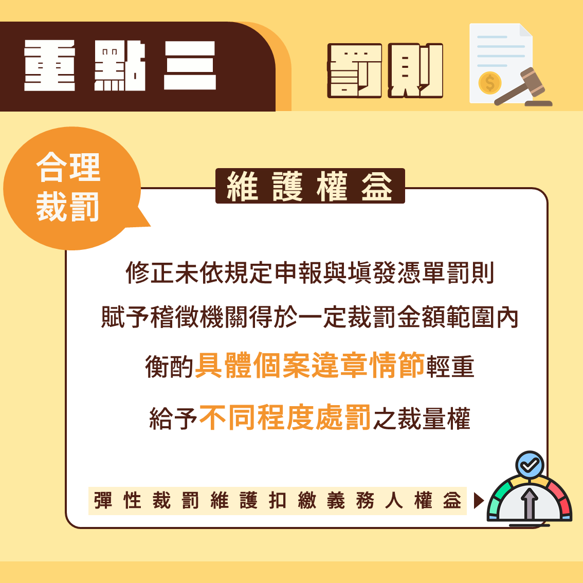 三、扣繳罰鍰裁量權:未依規定申報與填報憑單處罰規定,114年1月1日以後給付一律適用新制裁處規定,稽徵機關得於一定裁罰金額範圍內衡酌具體個案違章情節輕重,給予不同程度處罰之裁量權,維護扣繳義務人權益。