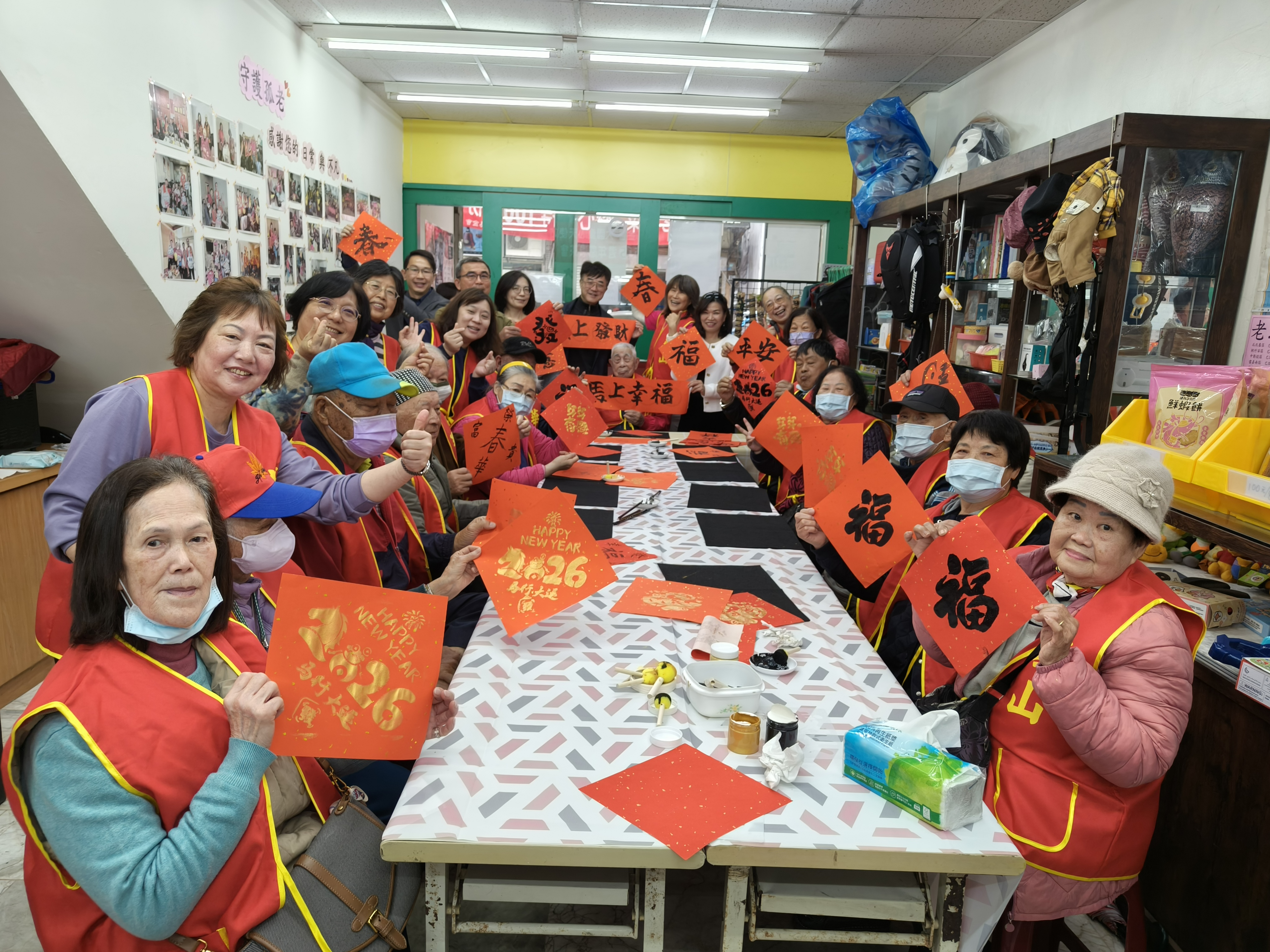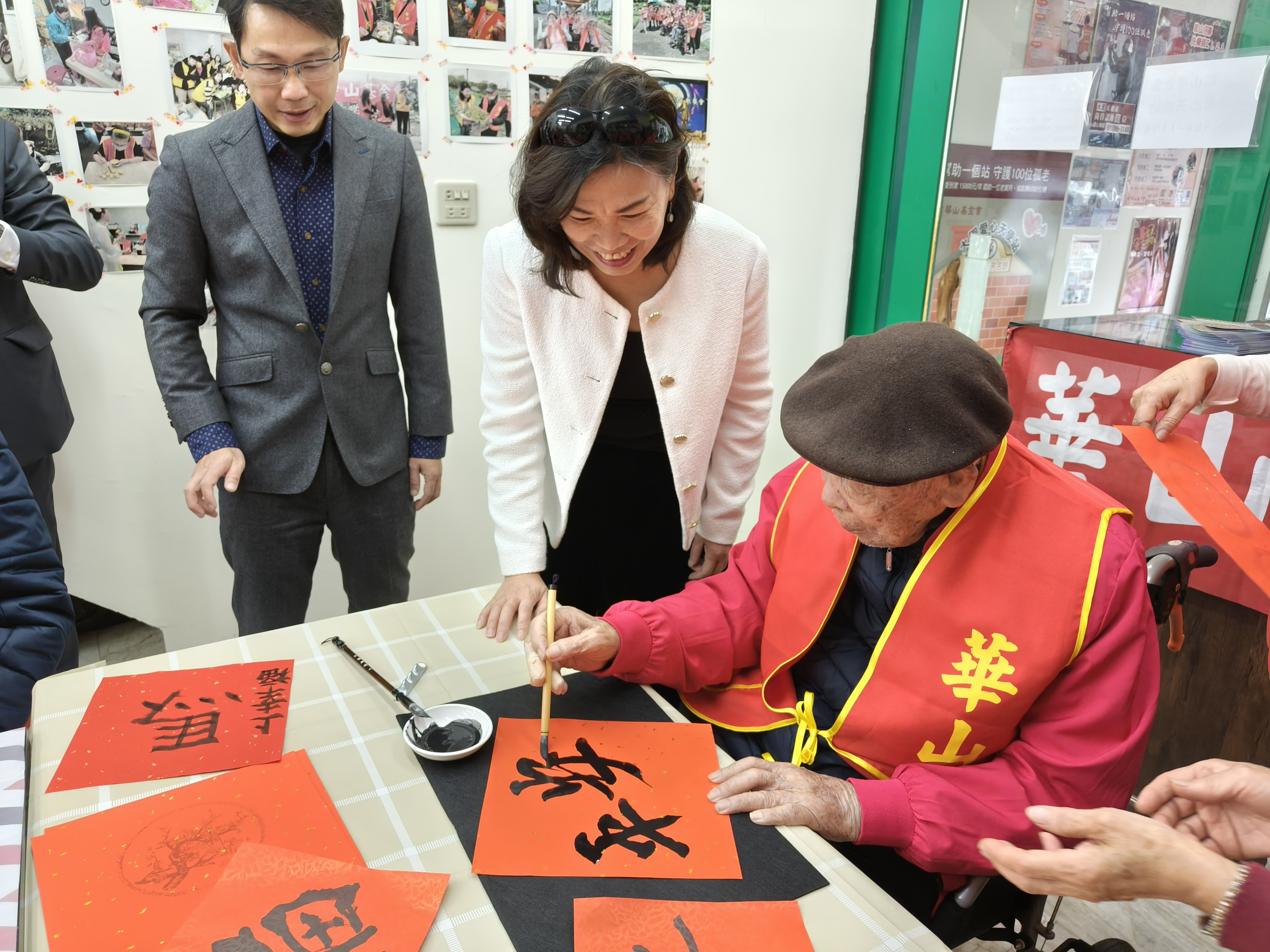 居住大園區,高齡99歲的游爺爺早年從事郵差長達42年,每日穿梭大街小巷,不畏風吹日晒雨淋,堅守崗位將一封封信送至家家戶戶,活動當天特邀游爺爺蒞臨現場,與12位老寶貝們一同揮毫寫春聯,祈願新年龍馬精神、馬鳴福至保安康。大園站建站15週年,到宅服務車里程數也累積近15萬公里,就像天使站的翅膀,陪伴站長上山下海,將服務送至長輩家中,特別感謝舒堃禾股份有限公司、惟善有限公司及許靜子女士支持到宅服務車汰舊換新,讓愛不停歇永續輪轉,也期盼各界支持送愛到家,傳遞善與溫暖到社會各個角落。