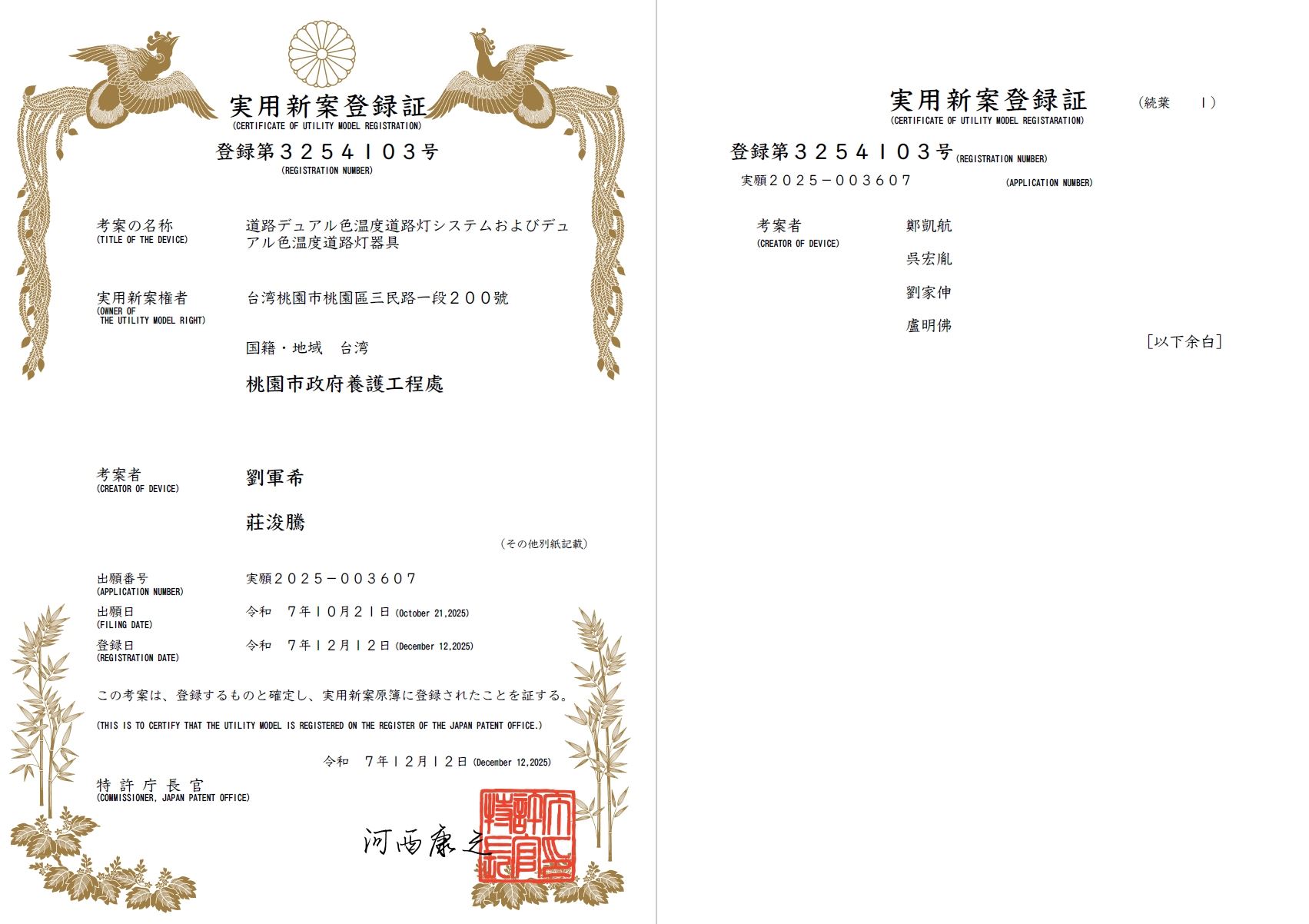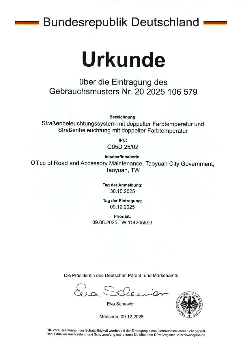 桃園市「路口雙色溫路燈」繼114年8月21日獲得台灣新型專利證書後,經本府再接再厲努力推廣,再獲國際肯定,於114年12月陸續榮獲日本及德國新型專利證書!