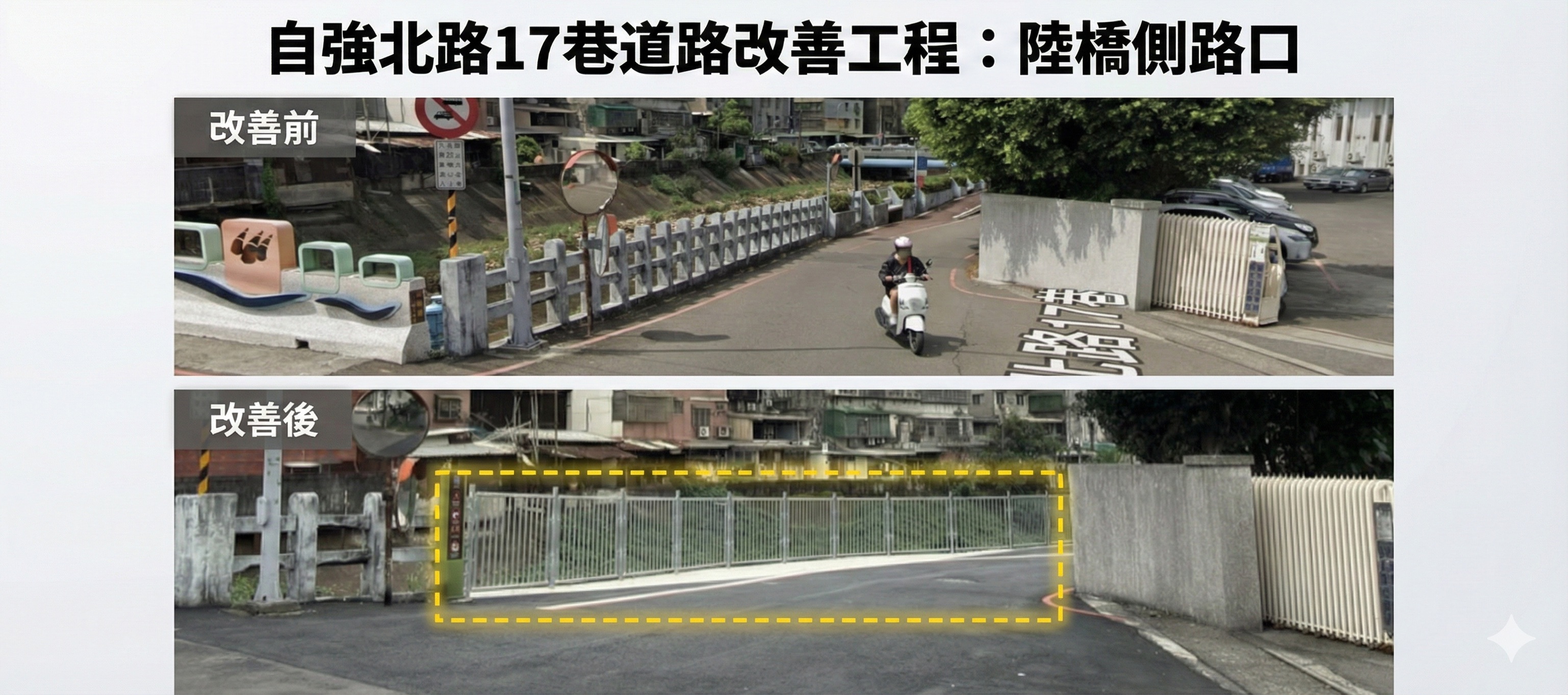 針對自強北路17巷靠近自強北路口路段,本處積極與台電公司協調,順利完成電桿遷移作業。同時進行路口喇叭口拓寬工程,藉此增加車輛轉向半徑,有效提升路口通行效率與行車視距,改善過往車輛轉向不易之情形。
