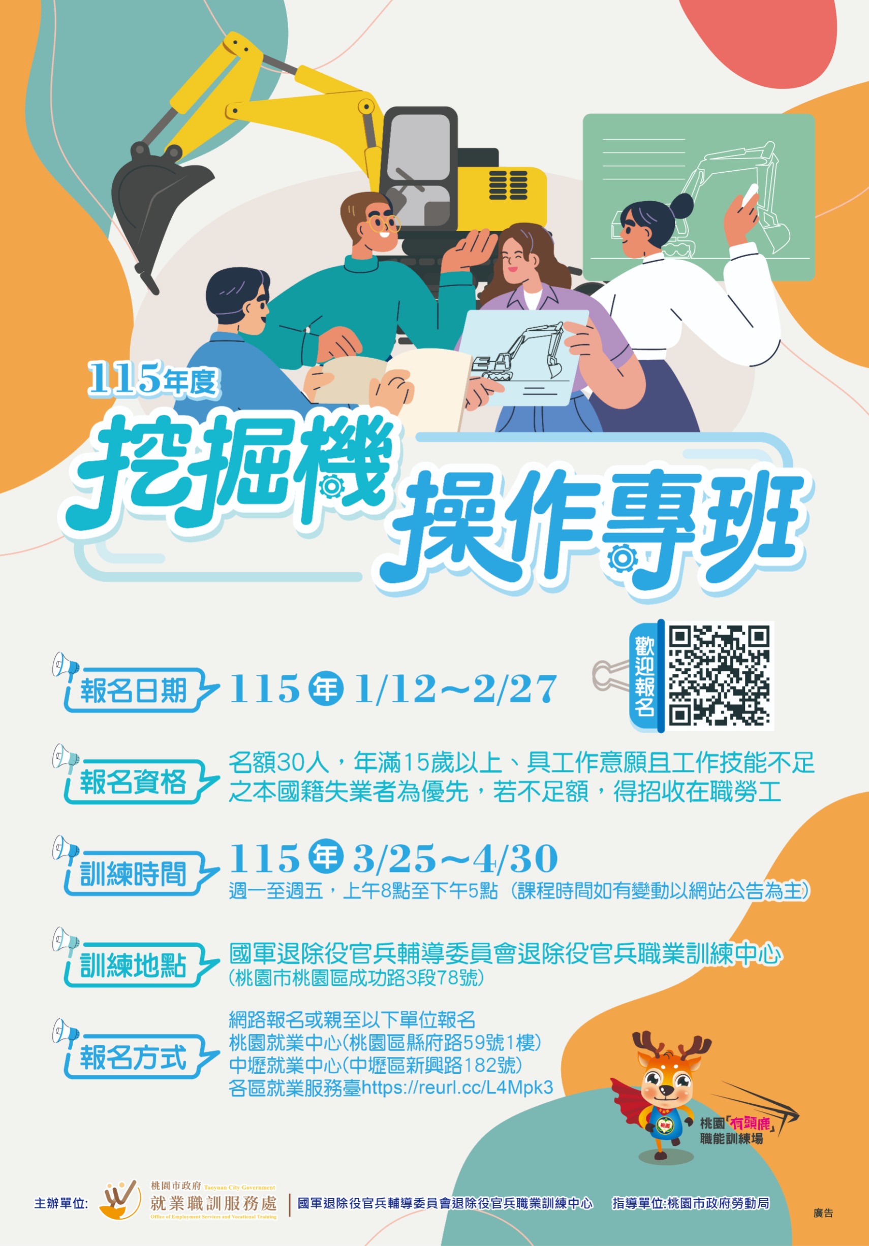 為協助勞工取得專業技能,並因應營造產業缺工,桃園市政府就業職訓服務處於115年度推出桃園「有頭鹿」職能訓練場-挖掘機操作專班,提供30個免費實機操作名額。只要年滿15歲以上之國民皆可報名,具工作意願且技能不足之本國籍失業者為優先,若名額未滿,得招收在職勞工。