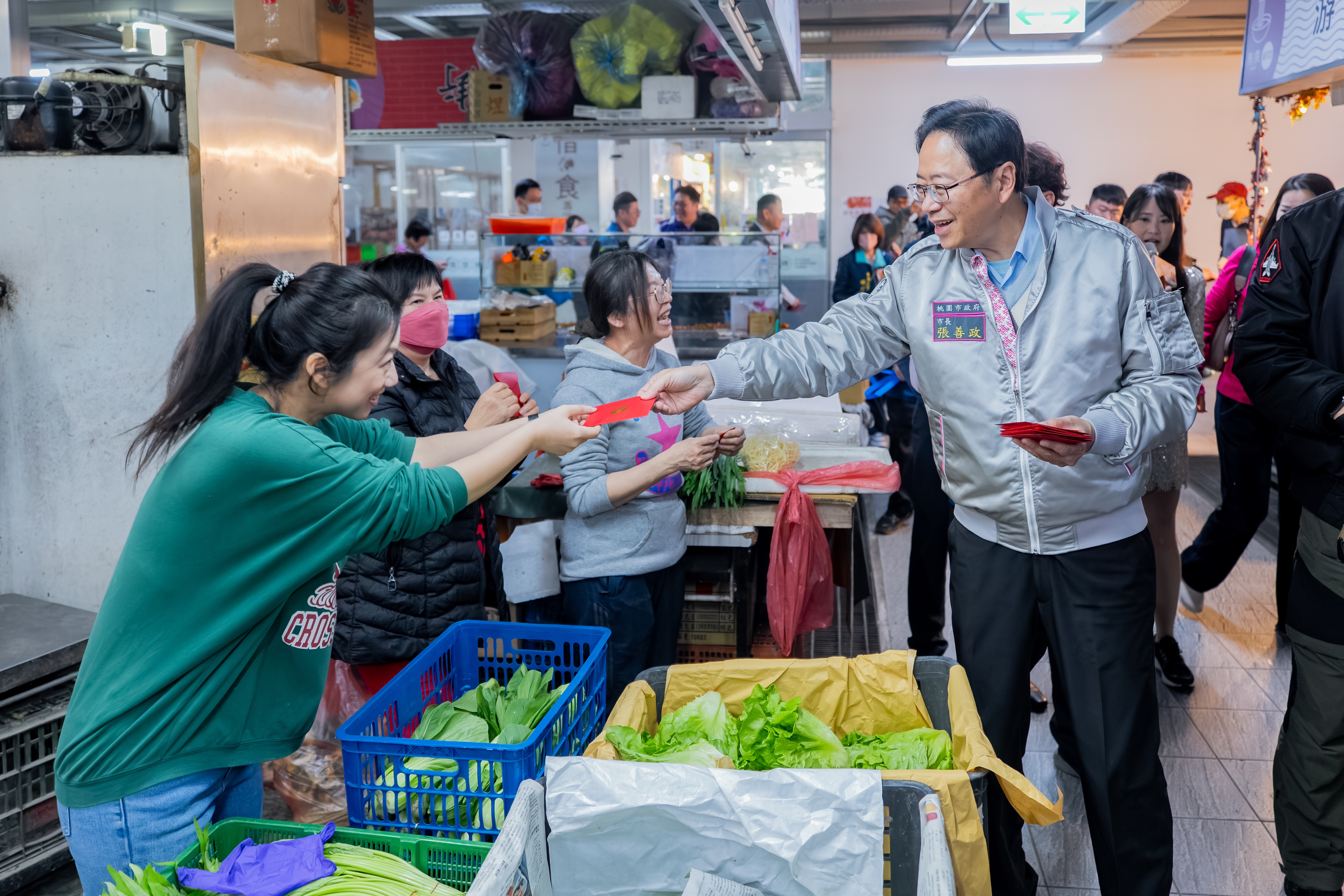 張市長說明,年味福袋每套商品價值約800元,將自明(5)日中午12點起於線上平臺以半價399元限量販售,民眾可依喜好選購心儀市場的特色商品,完成下單後再回到市場兌換,兼顧便利性與實體消費體驗,期盼讓市民買得划算、買得開心,也為市場攤商帶來實質人潮與買氣。