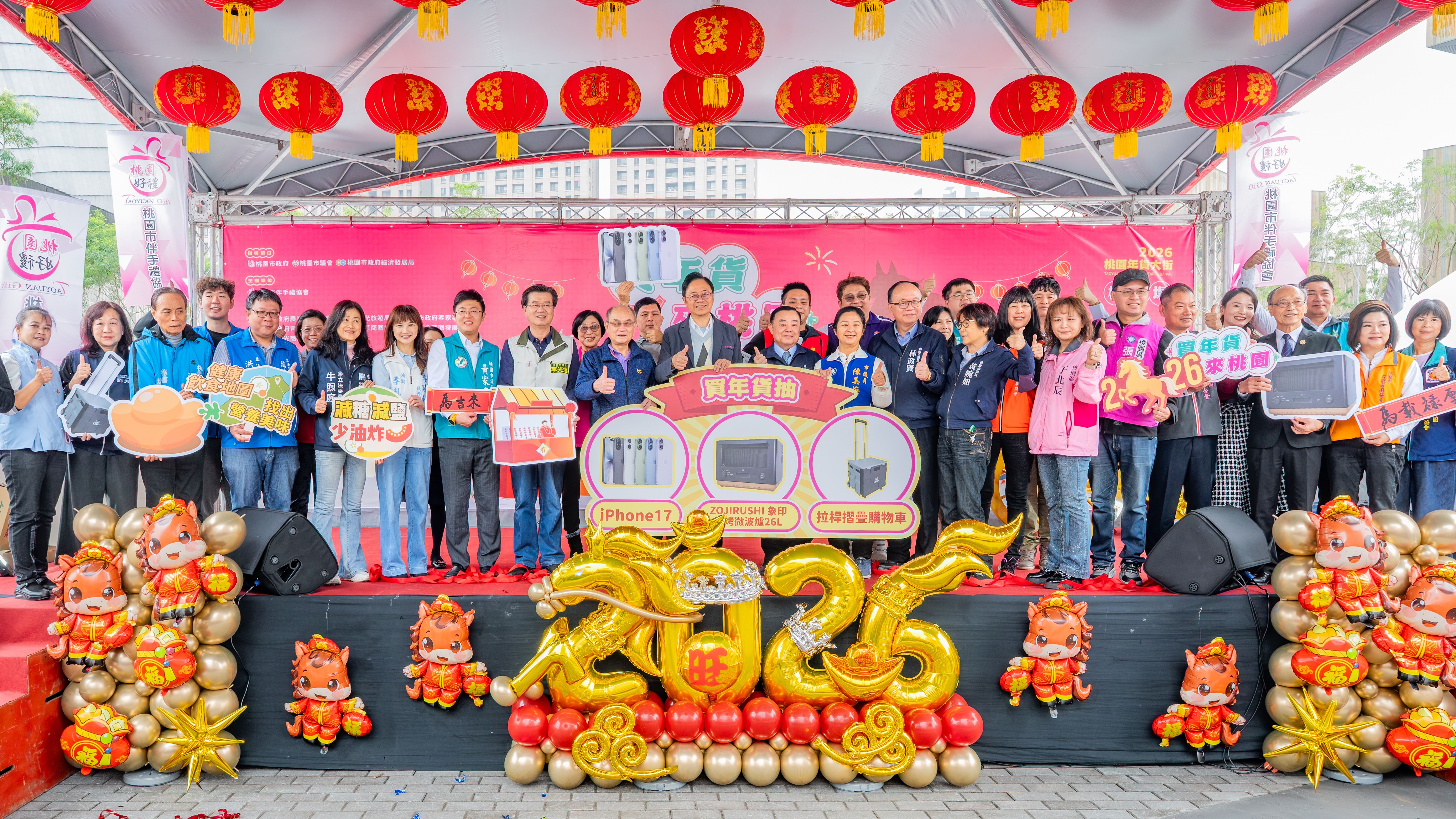 張市長也指出,桃園年貨大街集結豐富多元的年節商品,從南北乾貨、特色伴手禮到在地小農產品一應俱全,兼顧品質與價格,讓民眾「買得安心、買得實在」。活動期間消費滿額即可參加抽獎,有機會把最新款 iPhone 17 等多項大獎帶回家,增添逛市集的驚喜感。
