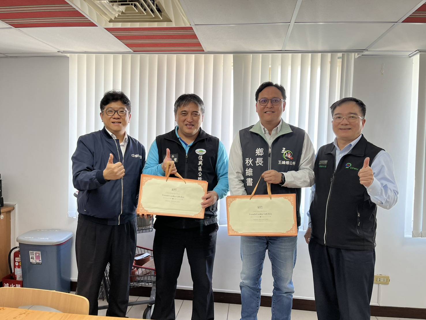 桃園郵局局長吳進益(左一)拜會桃園復興區區長蘇佐璽(左二)及新竹五峰鄉長秋維書(右二)。