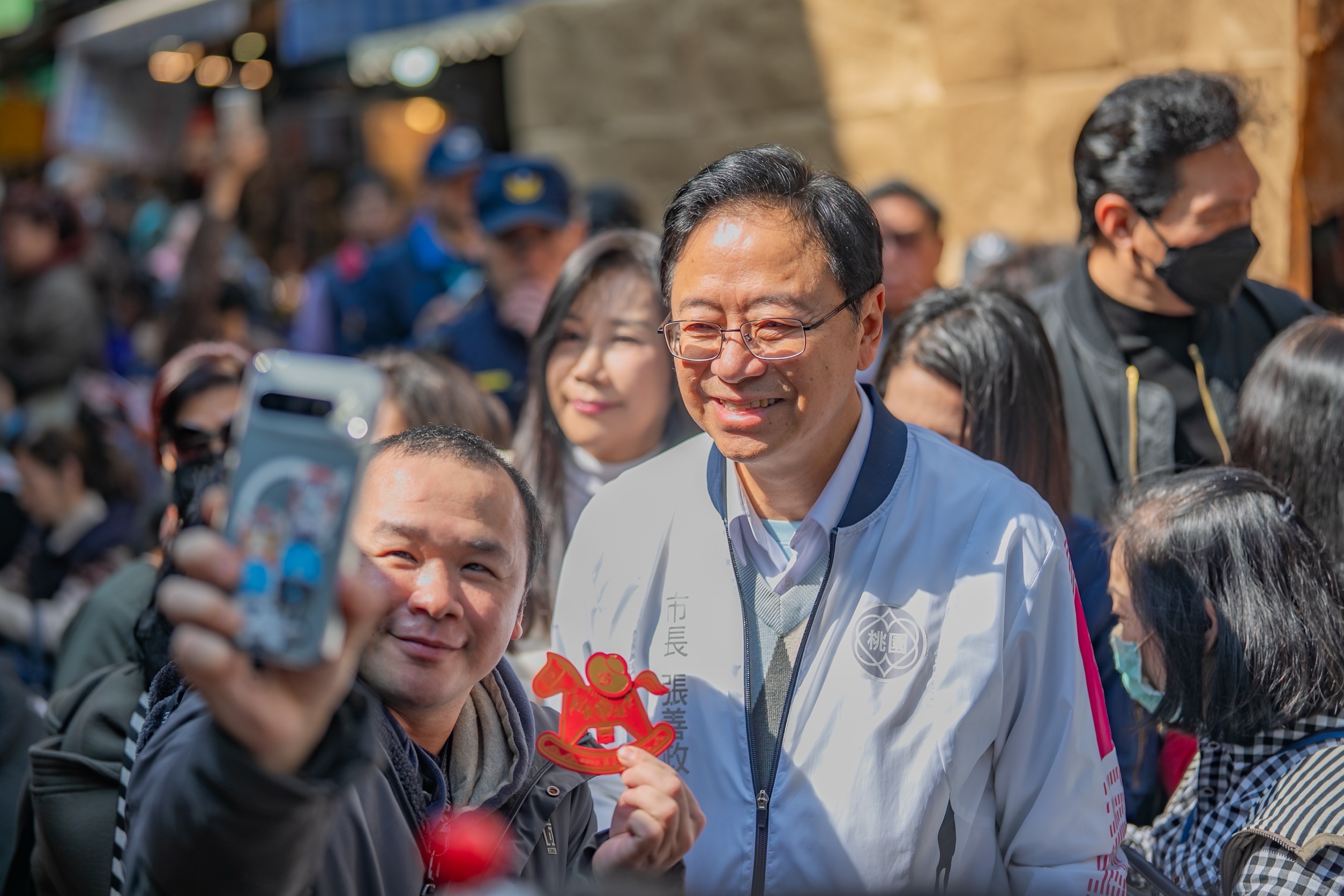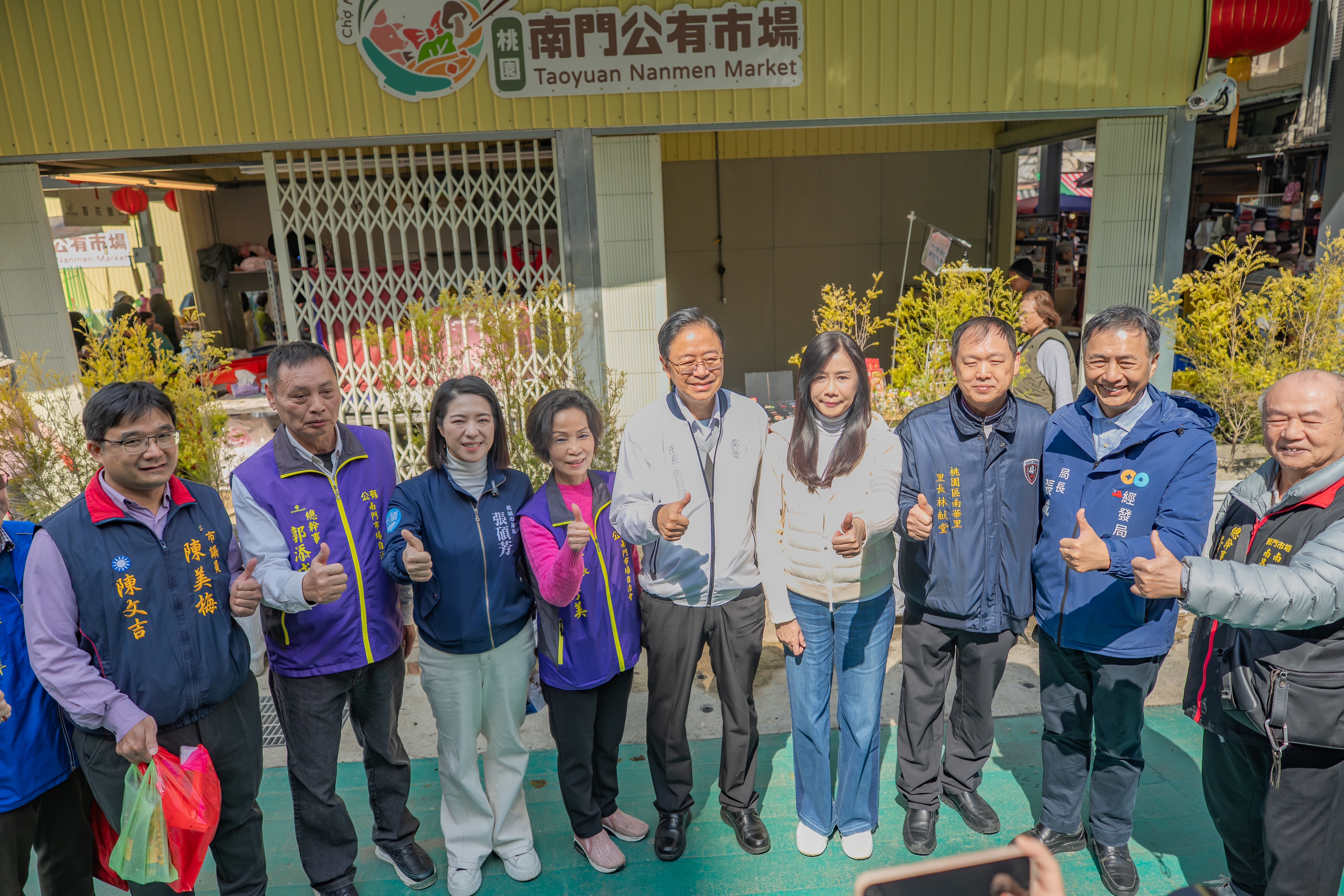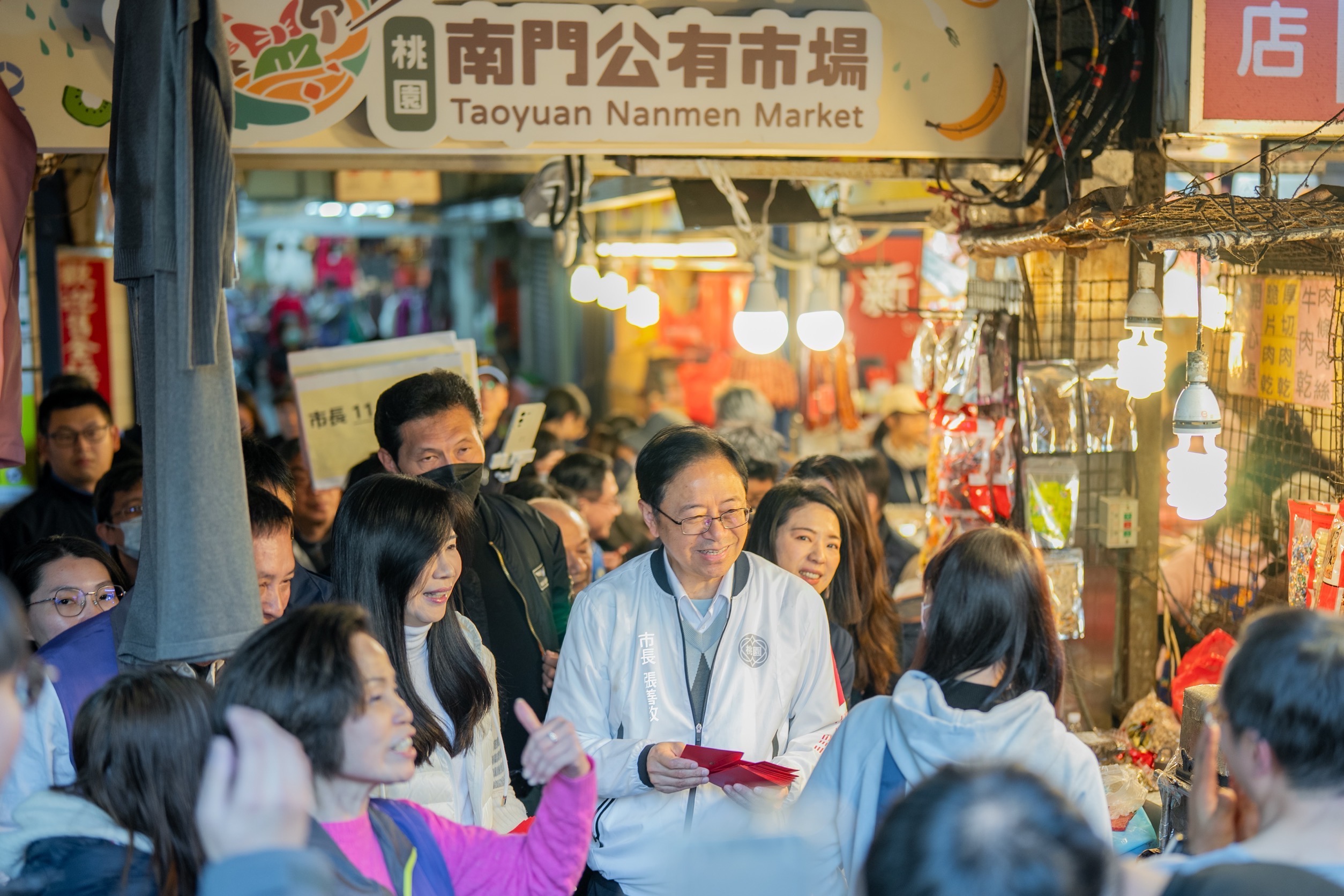 桃園市長張善政今(10)日上午前往南門市場,視察市場重新開張情形。適逢農曆春節前夕,現場採買年貨人潮踴躍,張市長沿街發送福袋,逐一向攤商及民眾拜早年,氣氛熱絡溫馨。