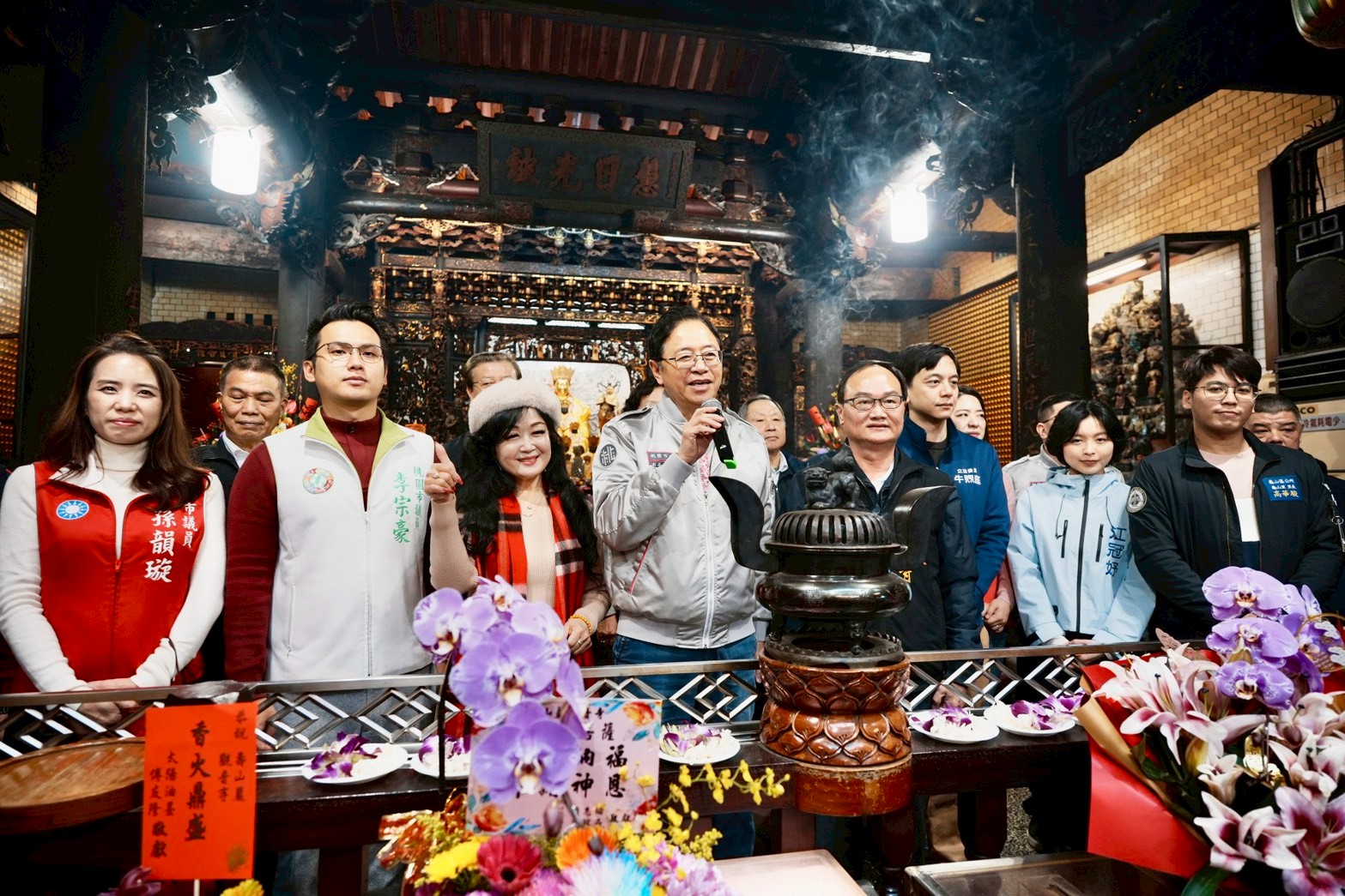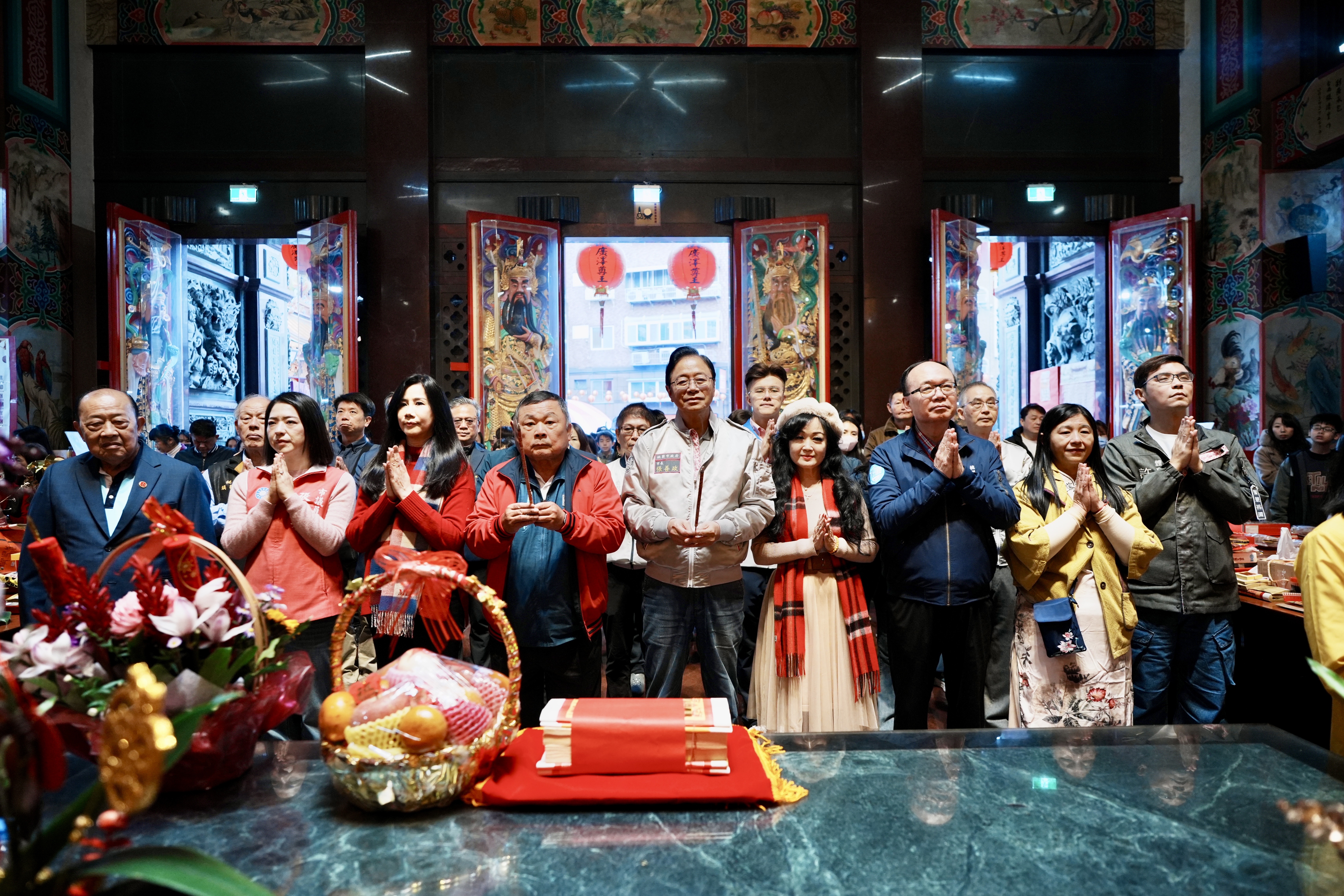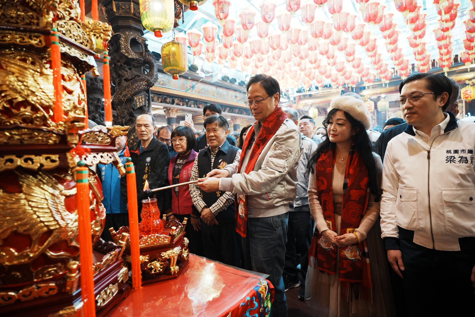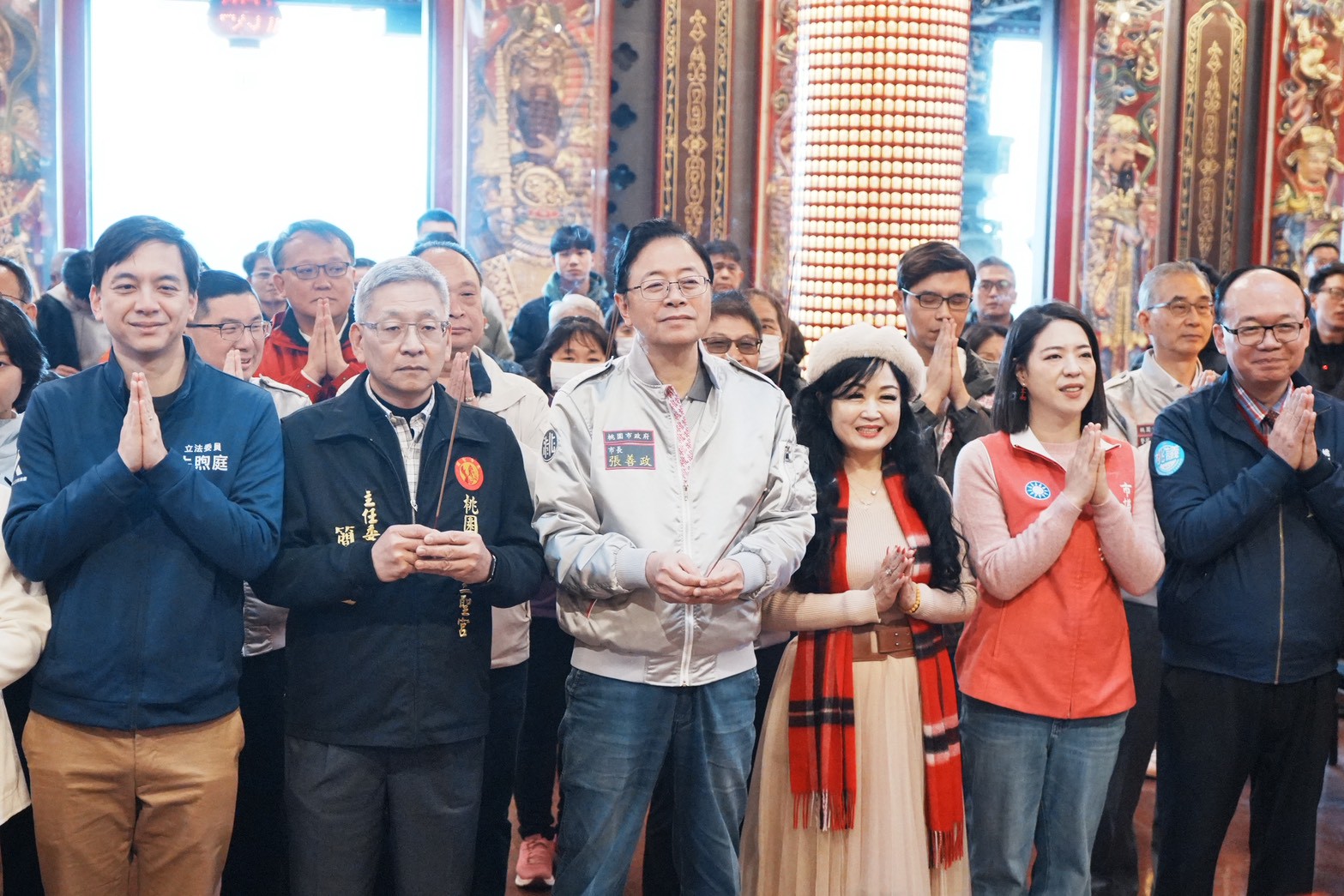 今日包括立法委員萬美玲、牛煦庭、市議員林政賢、梁為超、陳美梅、孫韻璇、張碩芳、劉曾玉春、彭俊豪、李宗豪、黃瓊慧、桃園慈護宮及景福宮主委簡征潭、鎮撫宮董事長許振現、龜山明倫三聖宮主委簡宗達、壽山巖觀音寺董事長林明義、中壢仁海宮董事長王介禧、慈惠堂董事長吳文樹、三教紫雲宮董事長許詩源等與張市長一同參與祈福。市府團隊則有民政局長劉思遠、青年局長侯佳齡、地稅局長姚世昌、警察局長廖恆裕、財政局長歐美鐶、體育局長許彥輝、民政局副局長藍品畯、風管處長廖育儀、龜山區長張嘉平、中壢區長李日強、桃園區副區長邱創正等一同出席。