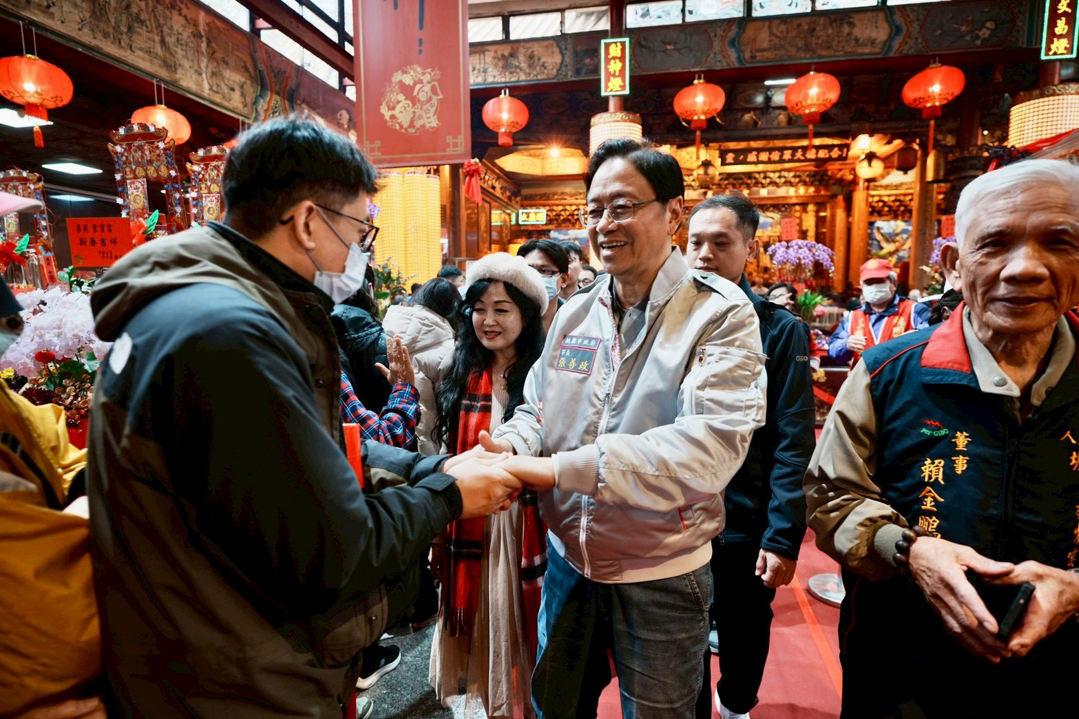 桃園市長張善政今(17)日分別前往桃園慈護宮、景福宮、鎮撫宮、龜山明倫三聖宮、壽山巖觀音寺、中壢仁海宮、慈惠堂、三教紫雲宮等宮廟參香祈福,發放「元氣搖搖馬」福袋,祝福民眾新年馬力全開、好運一路跟著走,並代表市府致贈各宮廟祈福金,祝願香火鼎盛。張市長表示,大年初一看到許多鄉親前來參拜,相信神明定會庇佑大家平安順遂,並以市府春聯賀詞「馬載祿厚」向民眾拜年,祝福新年快樂、身體健康,市府將持續努力推動市政讓桃園愈來愈好。