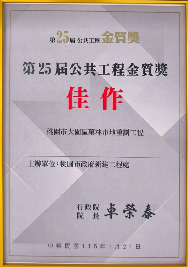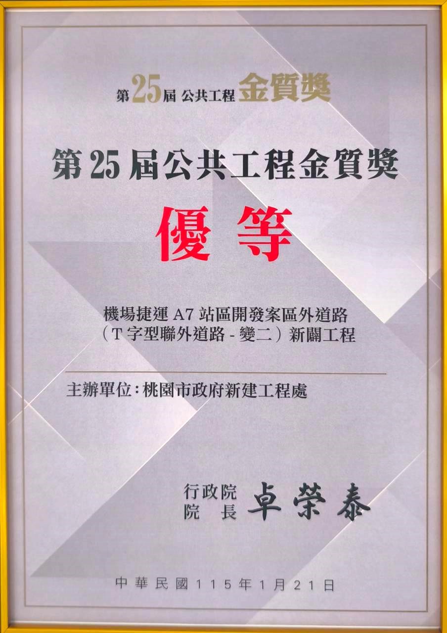 行政院公共工程委員會日前公布「第25屆公共工程金質獎」得獎名單並舉行頒獎典禮,表揚全國公共工程優良成果。桃園市政府新建工程處表現亮眼,共有2項工程脫穎而出,其中「機場捷運A7站區開發案區外道路(變二)新闢工程」榮獲土木類「優等」,「桃園市大園區菓林市地重劃工程」則獲土木類「佳作」,充分展現市府在公共工程規劃設計、施工品質及整體執行成效上的卓越成果。