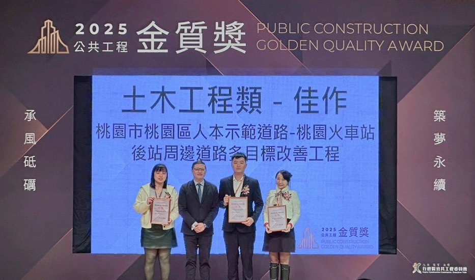 行政院公共工程委員會於 115 年 1 月 21 日舉辦「第 25 屆公共工程金質獎」頒獎典禮。桃園市政府養護工程處憑藉精湛的工程品質與維護管理能力,在全國激烈競爭中脫穎而出,分別以「復興區霞雲部落群公共設施及道路維護」榮獲公共設施維護管理獎佳作,以及「桃園區人本示範道路-桃園火車站後站周邊改善工程」榮獲土木類第 4 級佳作,展現市府深耕基層工程與打造友善環境的實質成果。