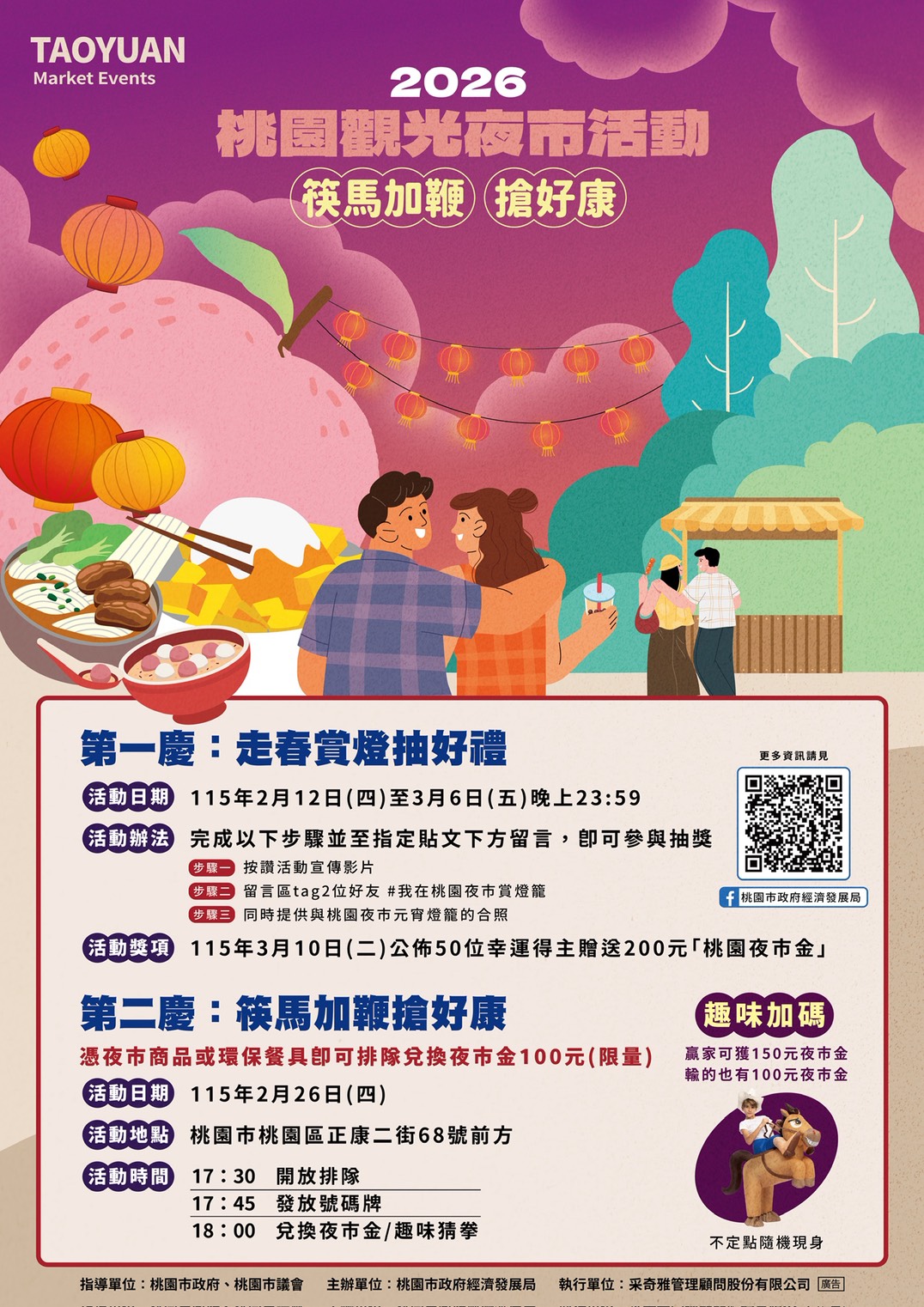 桃園市政府經濟發展局誠摯邀請市民朋友於元宵前夕走訪桃園觀光夜市,感受熱鬧節慶氛圍與在地美食魅力,一起歡度溫馨又有意義的元宵佳節。更多活動詳情,請至「桃園市政府經濟發展局」臉書粉絲專頁查詢。(https://www.facebook.com/EDB.TYCG)。