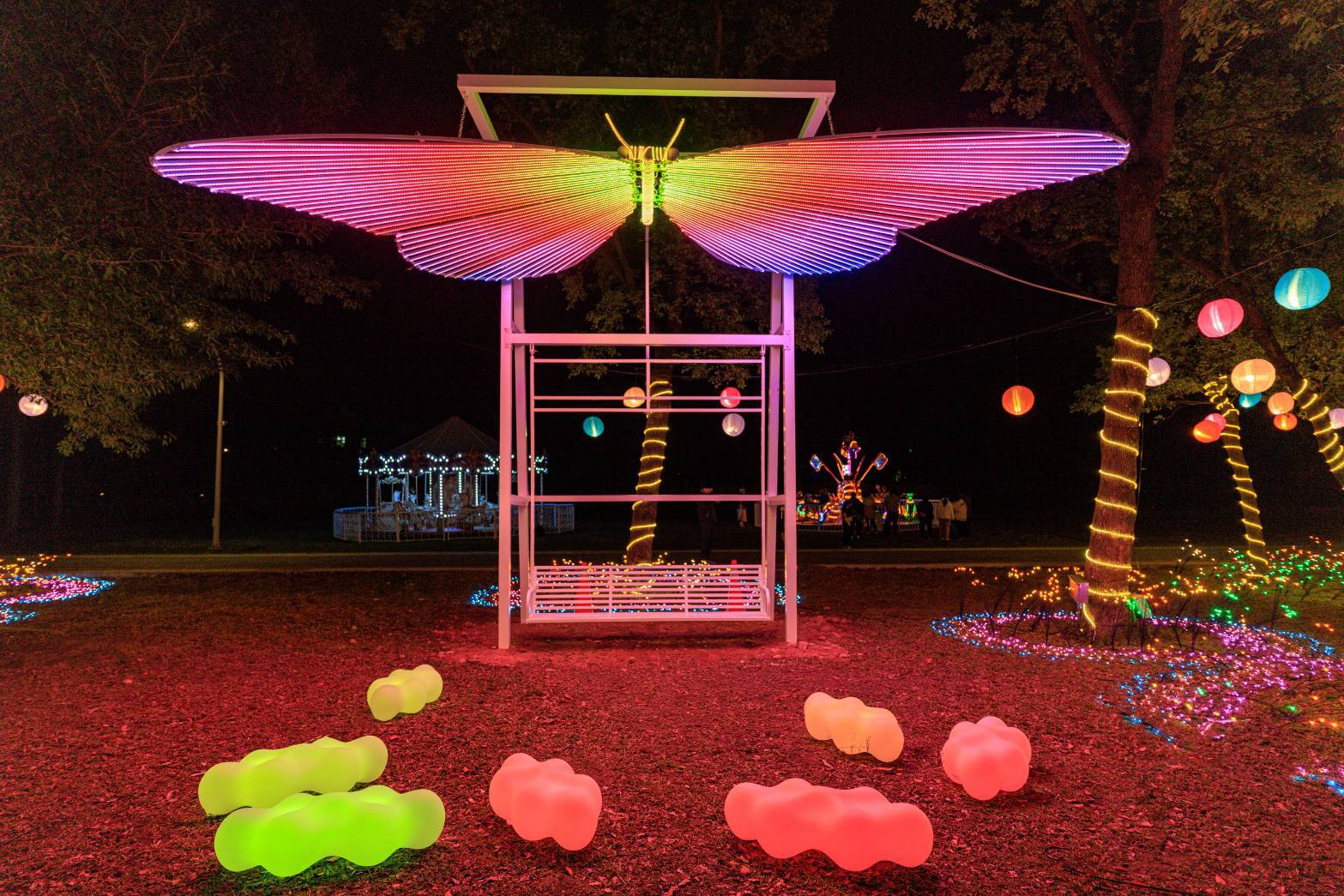 以壯闊的飛馬主燈為核心象徵,本屆桃園燈會於虎頭山創新園區打造主題燈區「未來光域」,作為展現桃園「國門之都」意象的序章,將城市的速度、勇氣與創新能量,轉化為直指夜空的光影宣言。除了有全國最大金屬飛馬主燈「飛馬耀桃園」外,環繞主燈的藝術裝置「靚靚桃林」,以繁盛柔亮的桃樹光影延伸飛馬動能,營造迎賓祝福的城市場域。