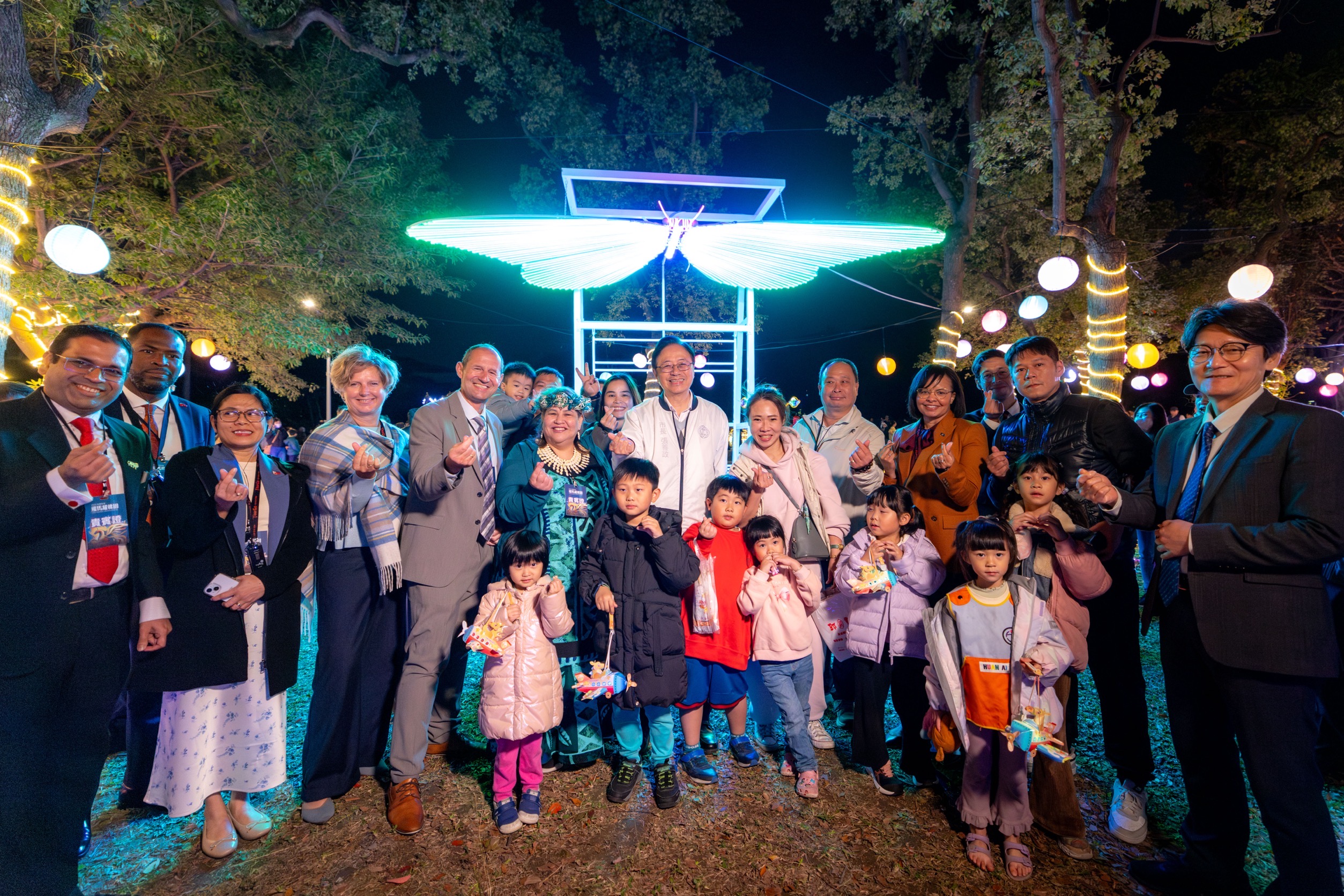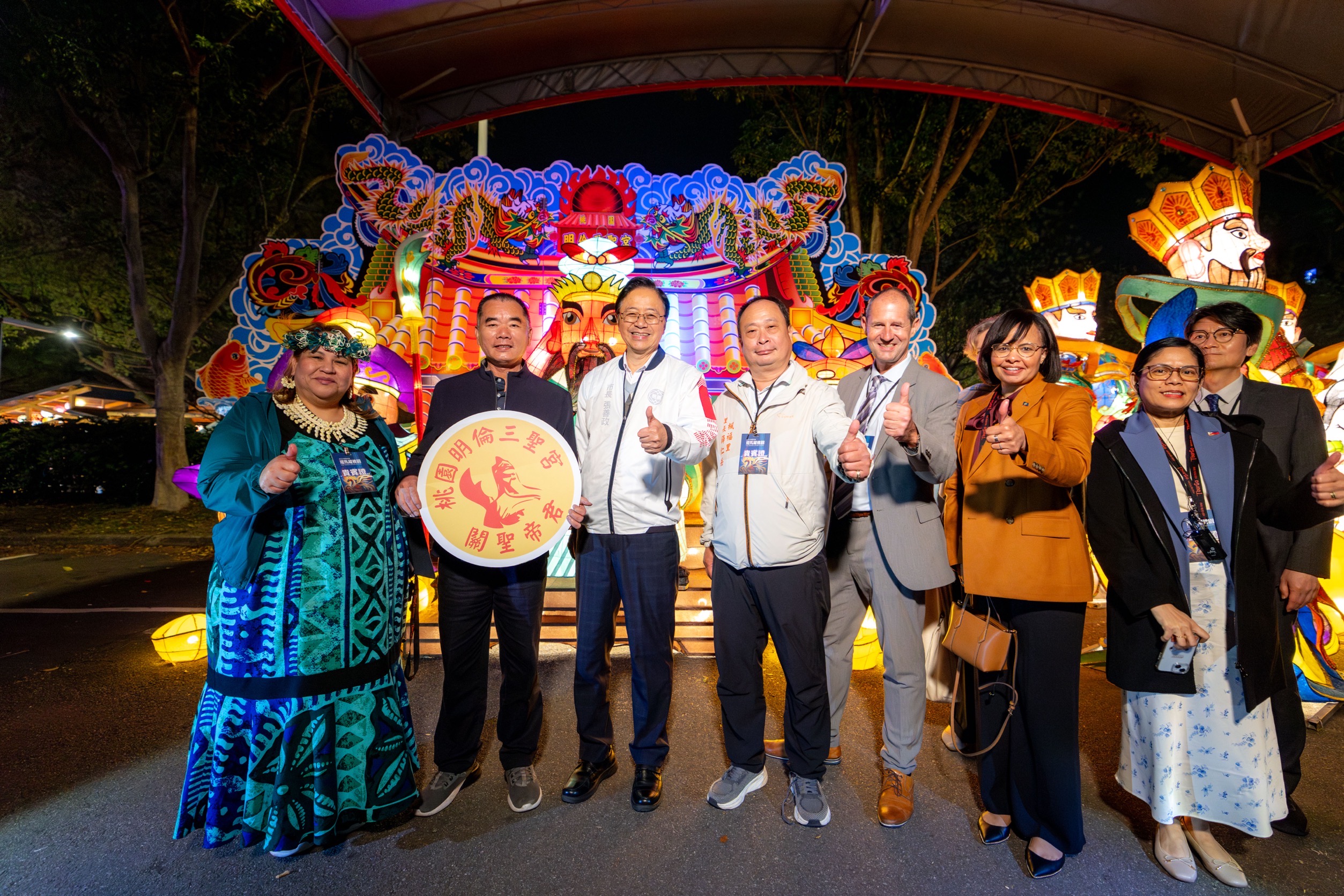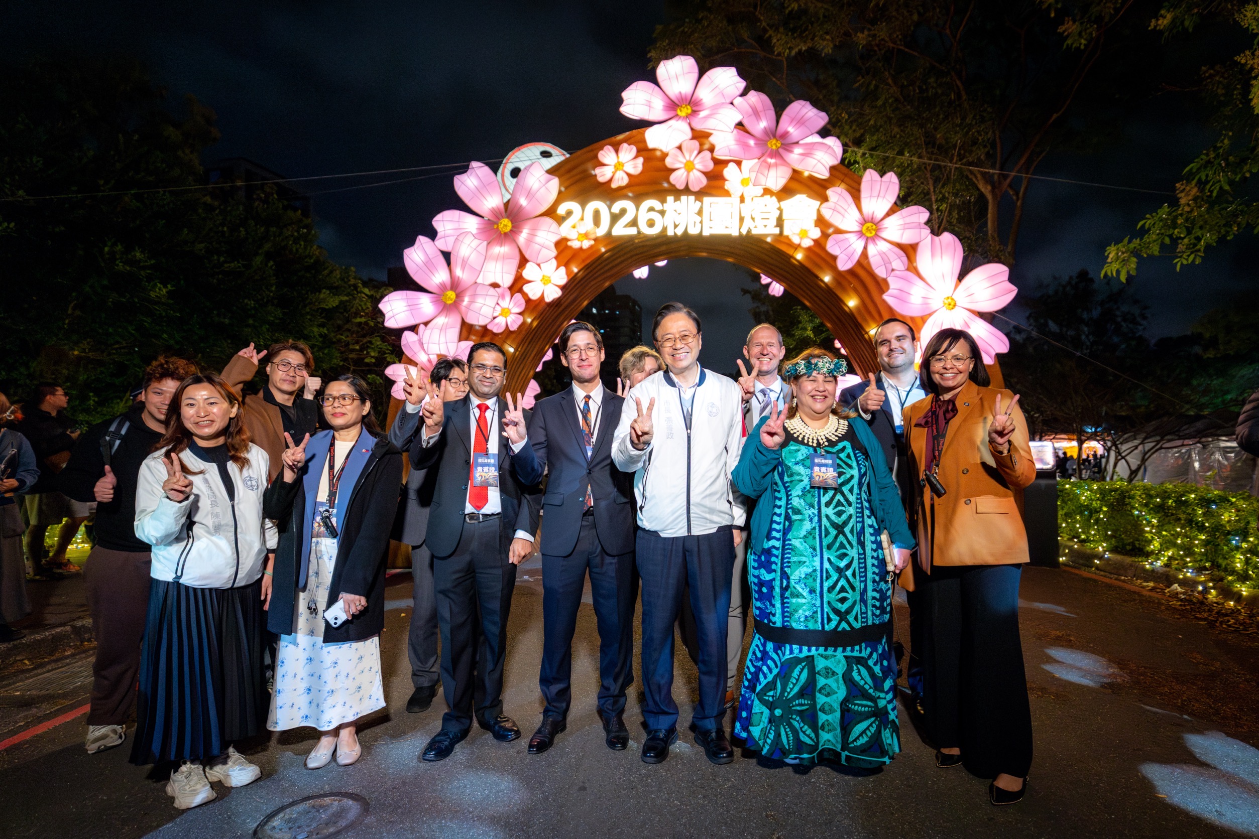 2月25日開幕當晚由震撼的主燈展演揭開2026桃園燈會序幕。本次燈會特別邀請來自馬紹爾群島、海地、貝里斯、烏蘭巴托、歐洲經貿辦事處、印度、韓國、瑞典貿易暨投資委員會、匈牙利、馬尼拉等國的駐台使節及代表,也邀請向來與桃園交流頻繁的日本牛久市、香川縣、千葉縣、神戶市、宮崎縣,以及韓國木浦市的貴賓一同共襄盛舉,與市民一同見證全台首創的機械金馬主燈首演,機械動態與專業的音樂編排,展現飛馬振翅躍升、奔向未來的意象,象徵桃園持續向世界前行的城市動能。