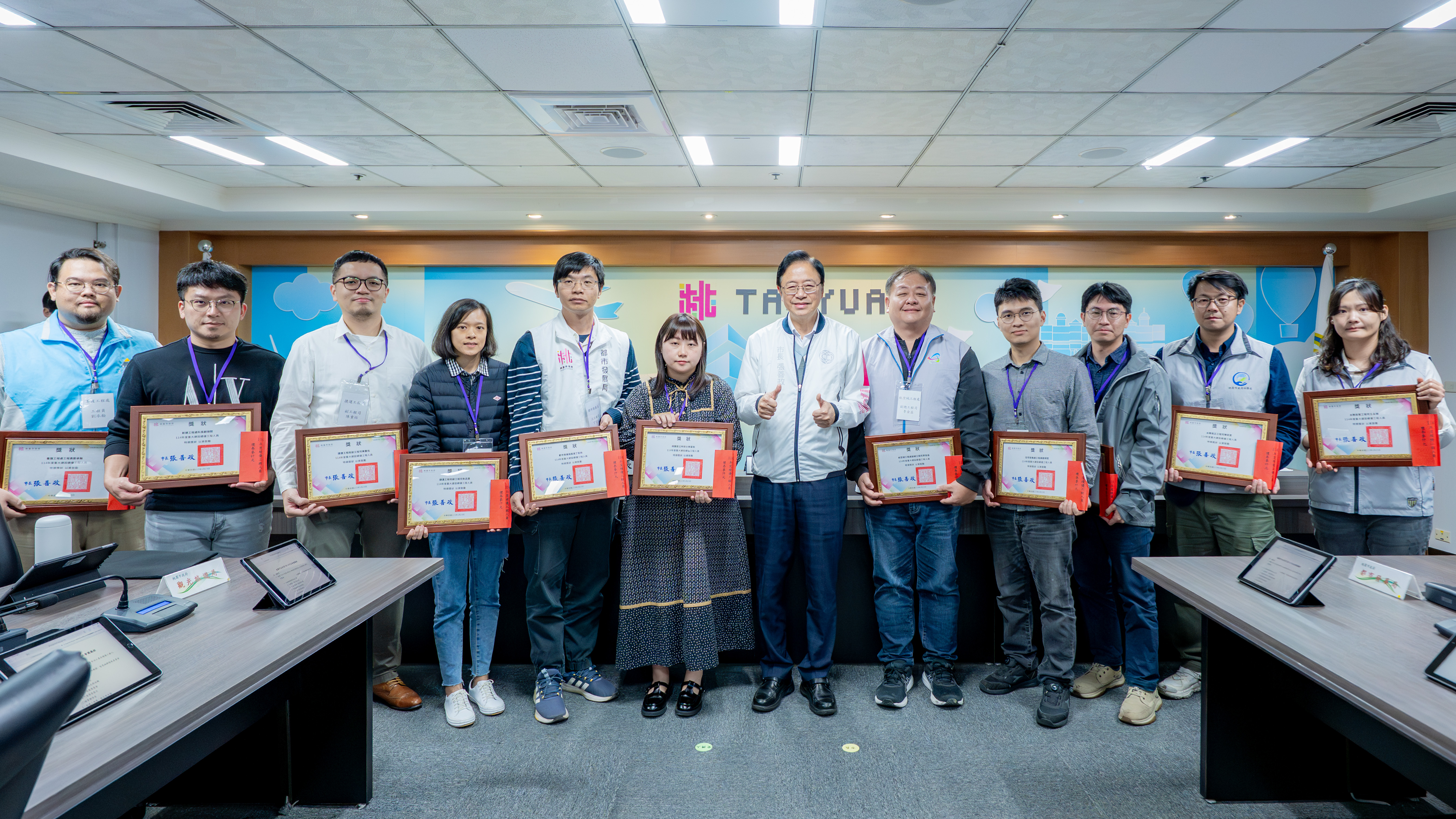 桃園市長張善政今(25)日下午主持市政會議,頒發「114年度重大建設工程風險預警有功人員及績優工程人員」。張市長表示,桃園各項重大建設正全面推展,涵蓋捷運路網、水務整治、公共工程及文化建築等面向,工程量體龐大、預算規模可觀,更需嚴謹專業把關。市府將持續強化工程管理與風險預警機制,確保各項建設如質如期完成,回應市民期待。