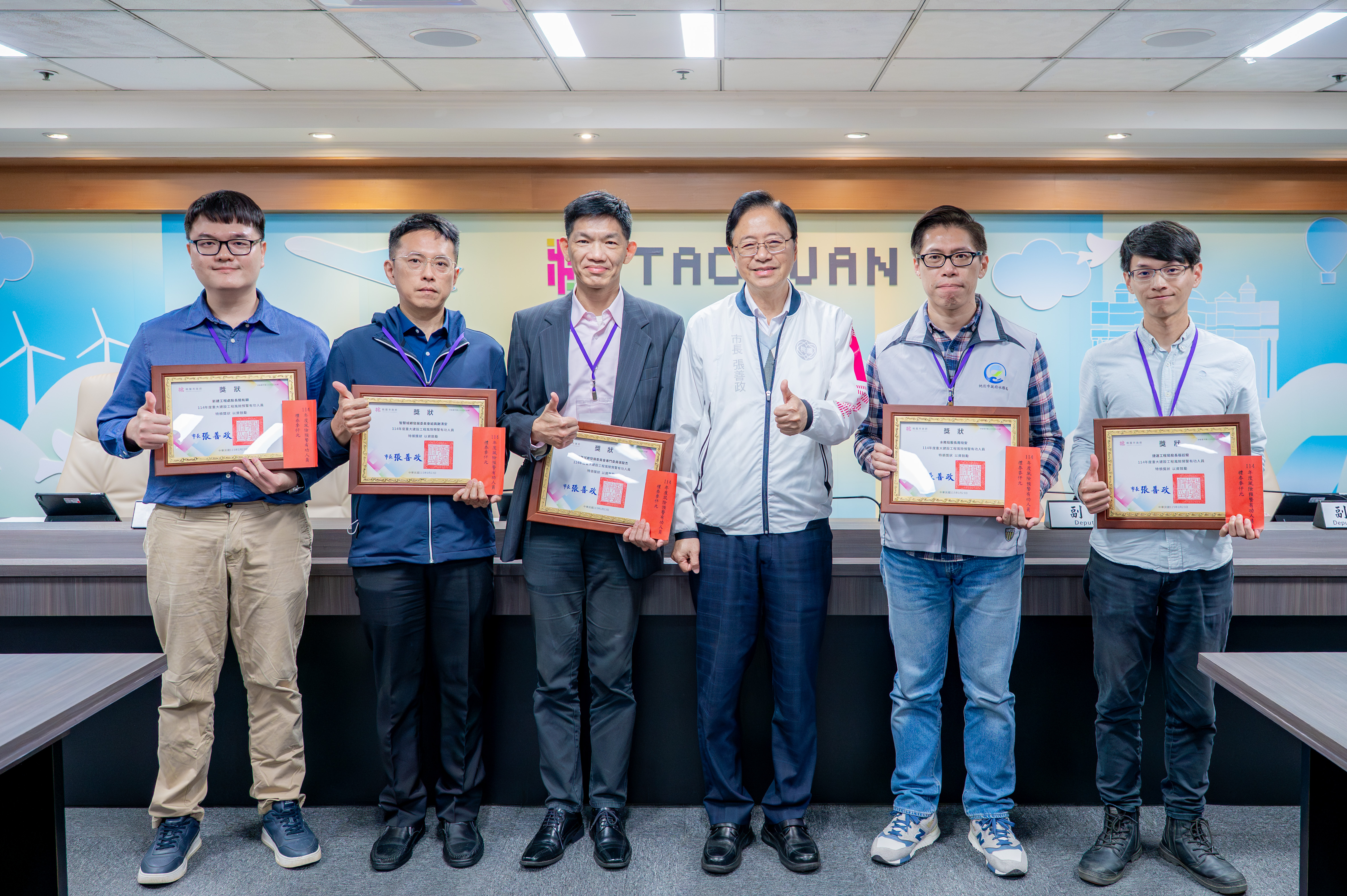 智慧城鄉發展委員會表示,114年度重大建設工程風險預警有功人員及績優工程人員共計16人獲獎。風險預警有功者包含:水務局股長周玟安、捷運工程局股長張廷駿、智慧城鄉發展委員會專門委員張聖杰、組員謝清安及新建工程處股長簡有顯等5位。績優工程人員則由水務局幫工程司王永琳、正工程司陳奕旻、文化局技士詹子穎、住宅發展處工程員劉得笙、航空城工程處副總工程司李金益、桃園區公所技士林宣如、都市發展局正工程司丁宏欣、捷運工程局副工程司朱品嘉、副工程司陳重佑、新建工程處科長劉碩閎及養護工程處工程員劉承翰等11位同仁獲選。