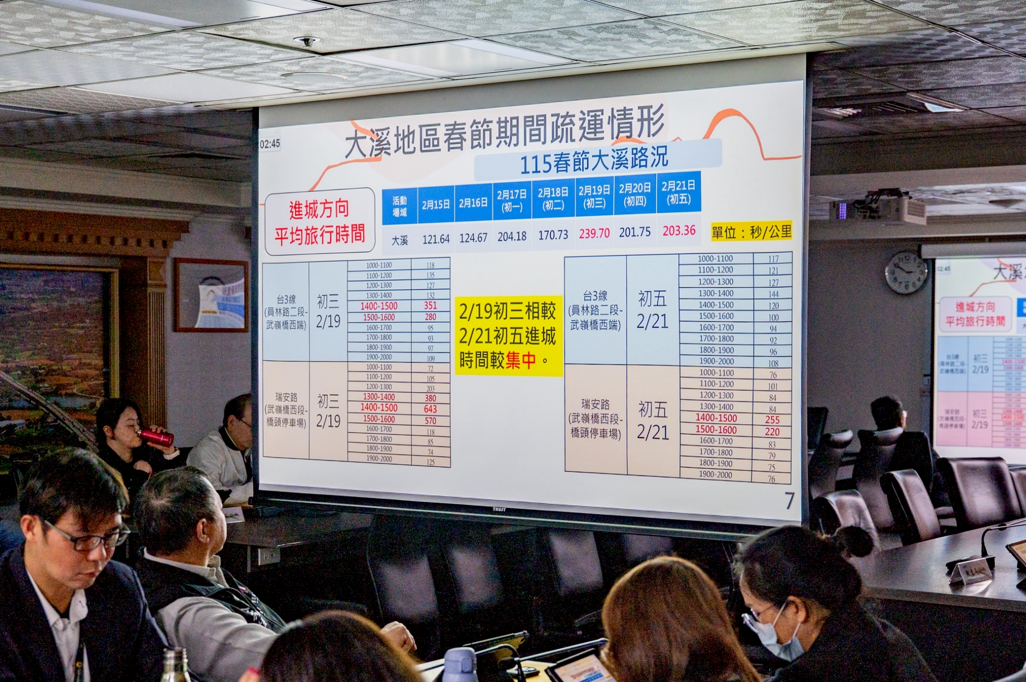 副市長王明鉅則建議交通局針對春節期間大溪地區每日、每時段車流量與旅行時間差異進行深入比對,作為未來研擬疏運策略的重要依據,讓市民在連假期間出行更為順暢、安全。