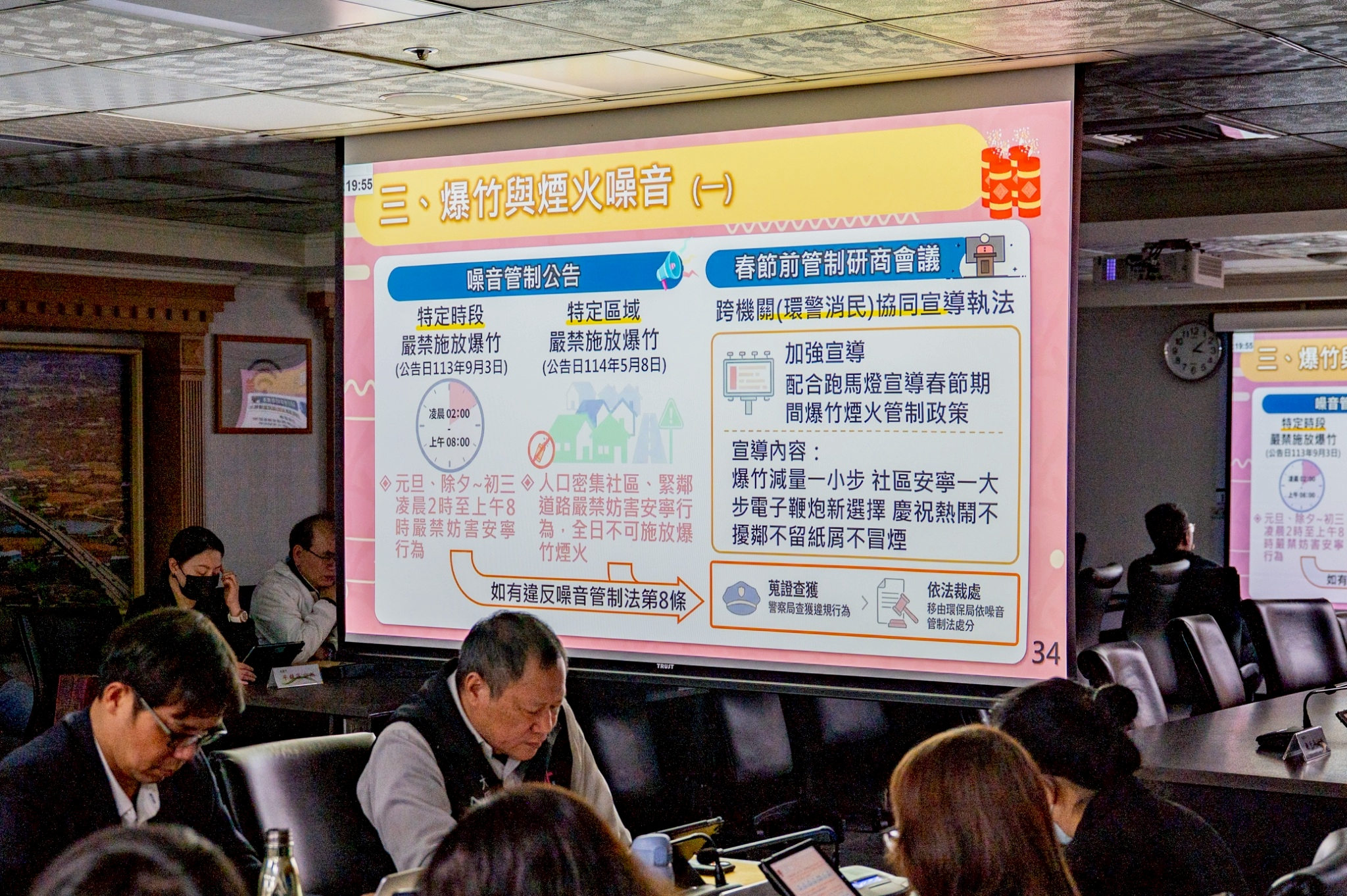 副市長蘇俊賓指出,今年環保、消防及民政系統已同步強化宣導,市民對生活品質要求提升,陳情量亦相對增加,建議針對高陳情熱點預先部署警力與稽查人力,並評估現行管制時段的適切性。蘇俊賓亦同時提醒環保局,年節前後垃圾量激增且天氣乾燥,應預先規劃垃圾暫置與防火措施,避免悶燒風險,確保市民居住安全。
