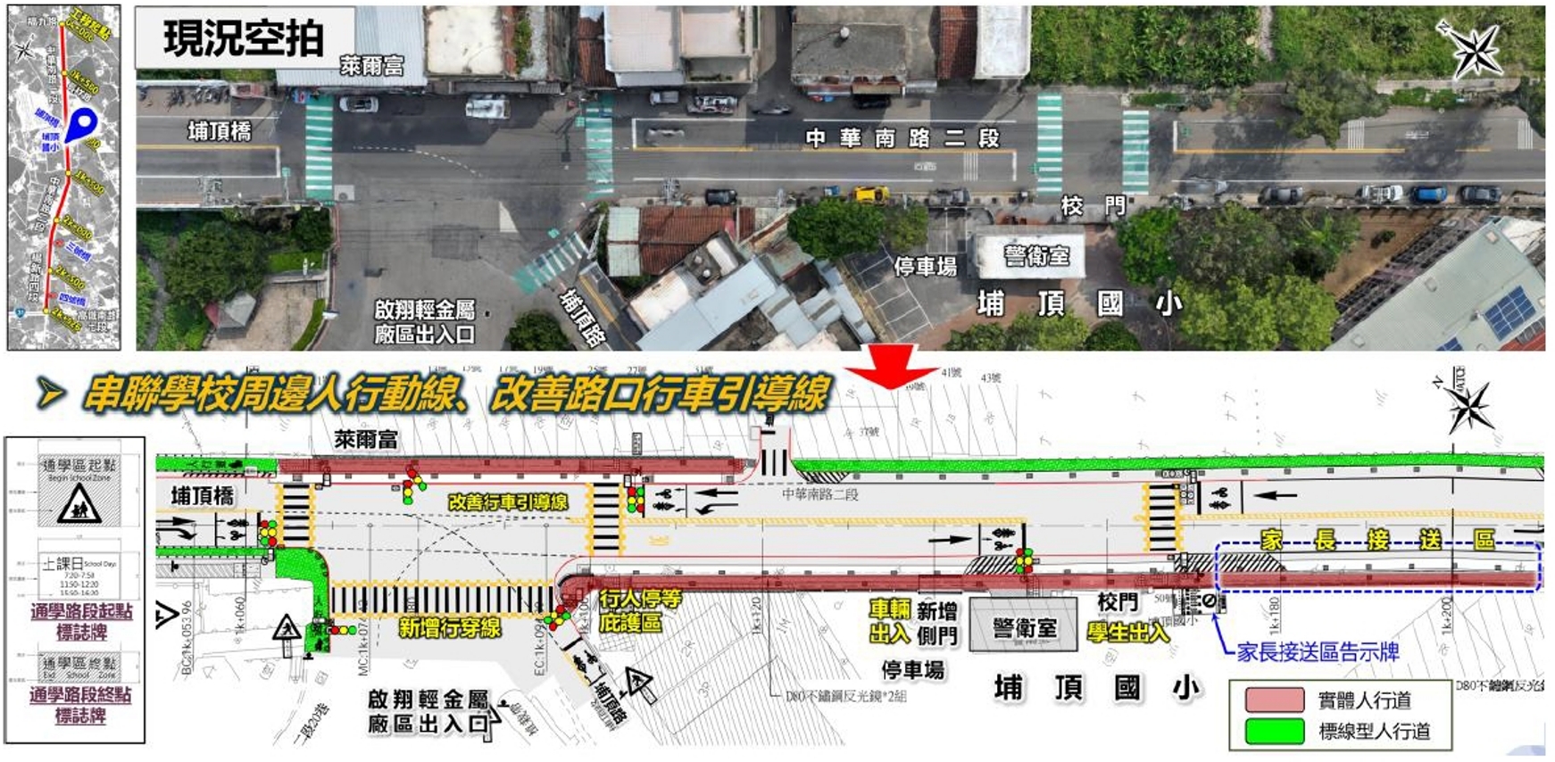 1.人本交通環境:全線規劃人行道,確保路人行進安全與連續性,也一併針對「埔頂國小」學區,設置通學步道、專屬家長接送區與寬廣人行步道,保障學童通學環境安全。