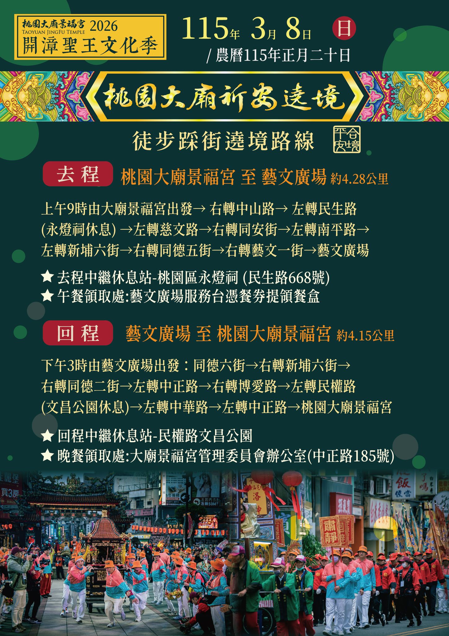 本次活動由景福宮邀集市府相關局處共同協力辦理,踩街陣容堅強,包含桃園在地鈞天社、溜冰龍、扮仙Cosplay,以及難得一見的十二花神蜈蚣閣等特色隊伍。此外,為鼓勵青年世代參與傳統民俗活動,亦邀請大勇國小北管、莊敬國小太鼓隊、宋江陣、北科附工儀隊、龍潭高中儀隊及壽山高中康輔社等團隊共同展演,展現桃園兼具傳統底蘊與青春活力的文化風貌。