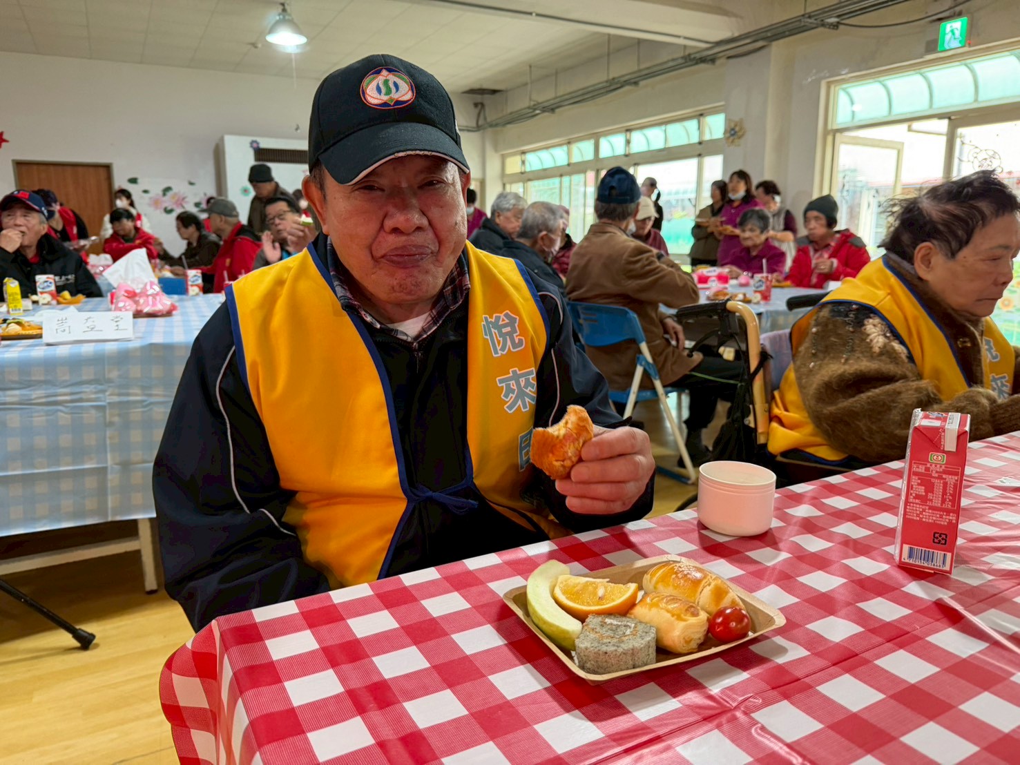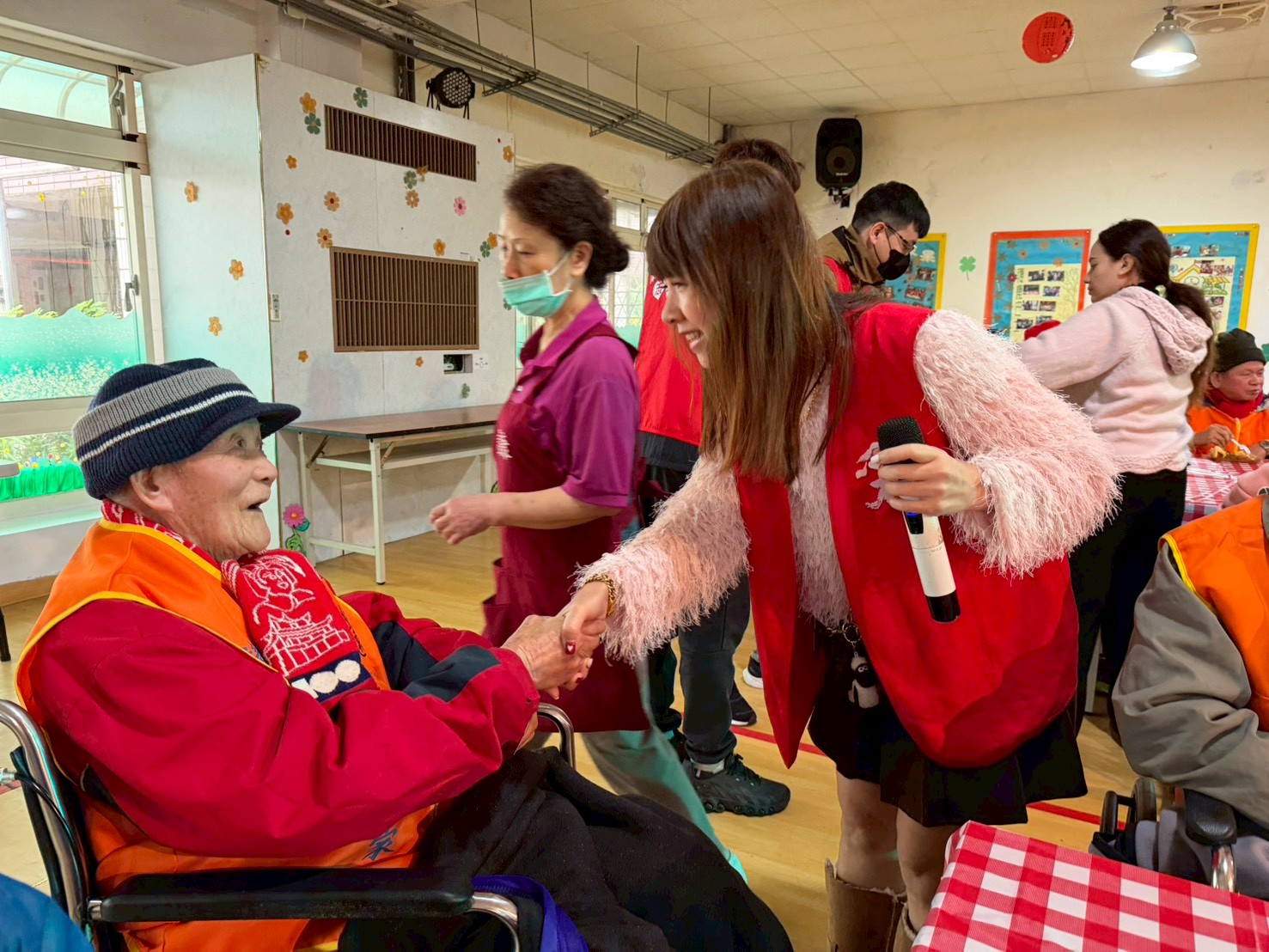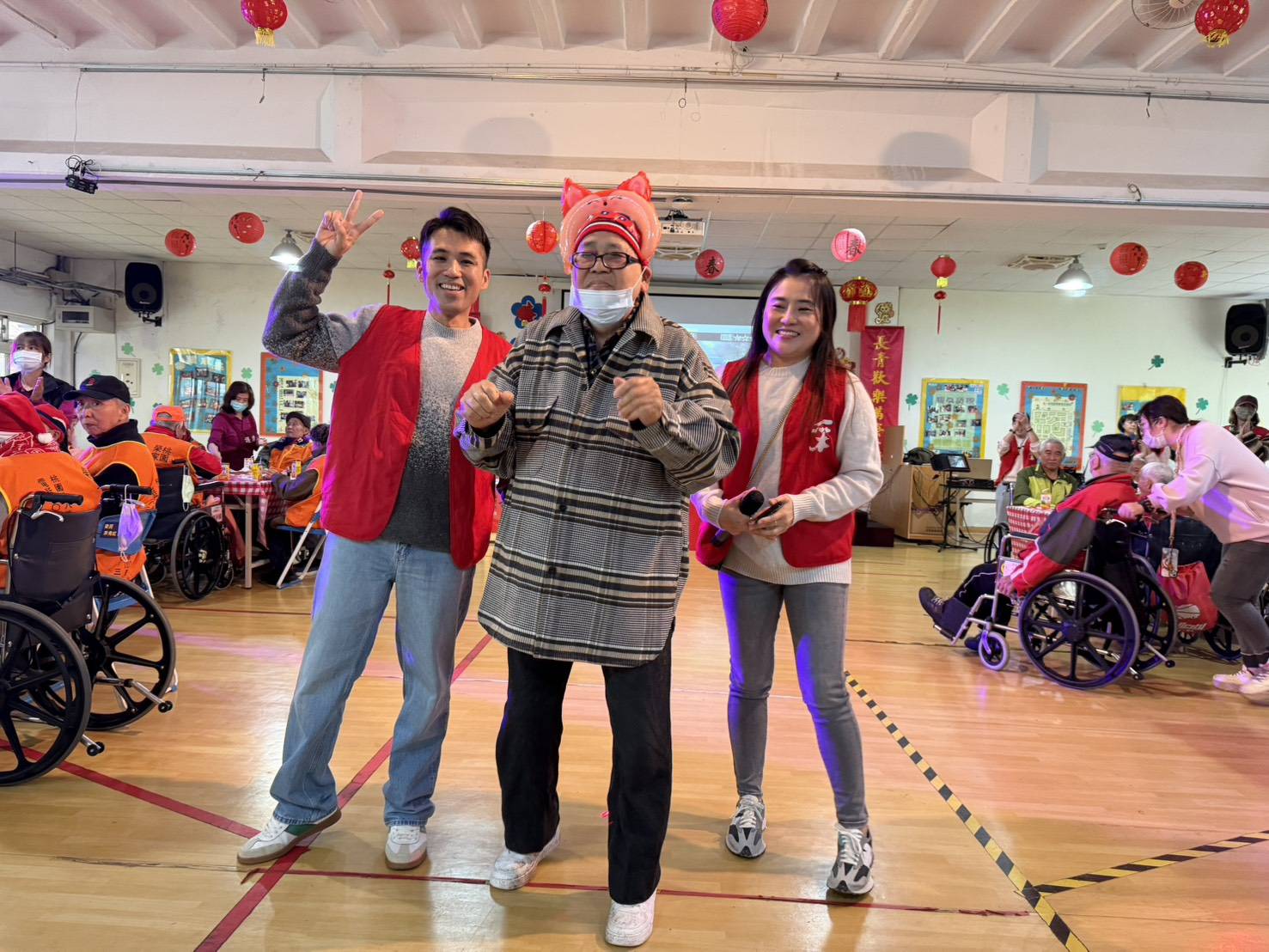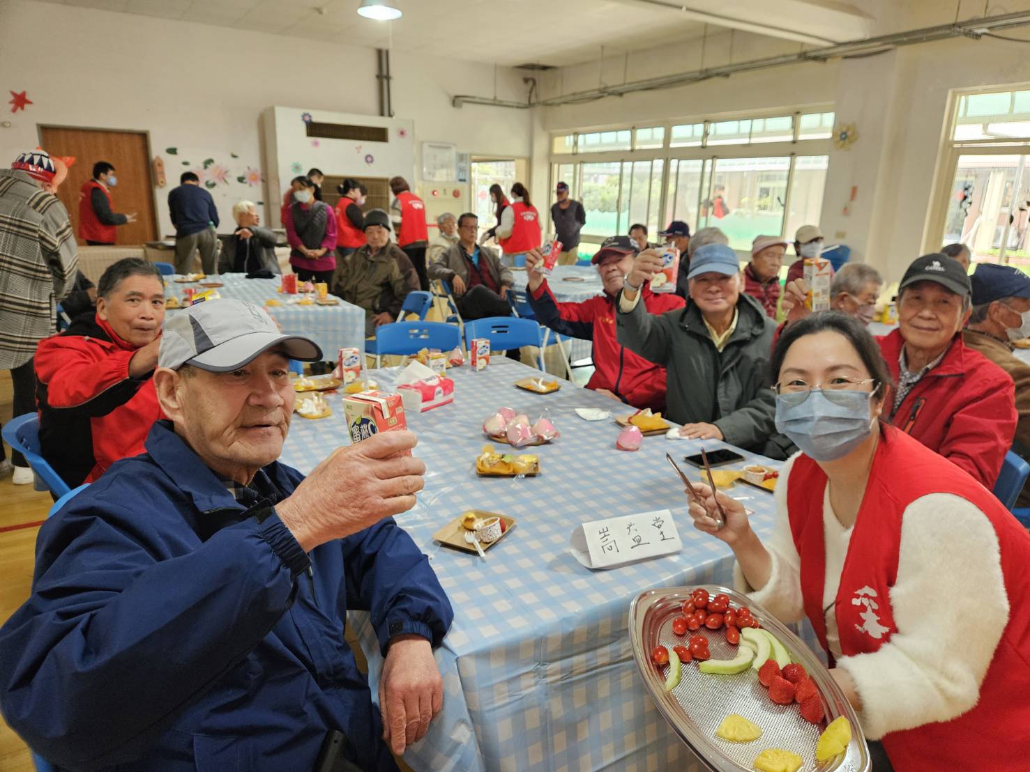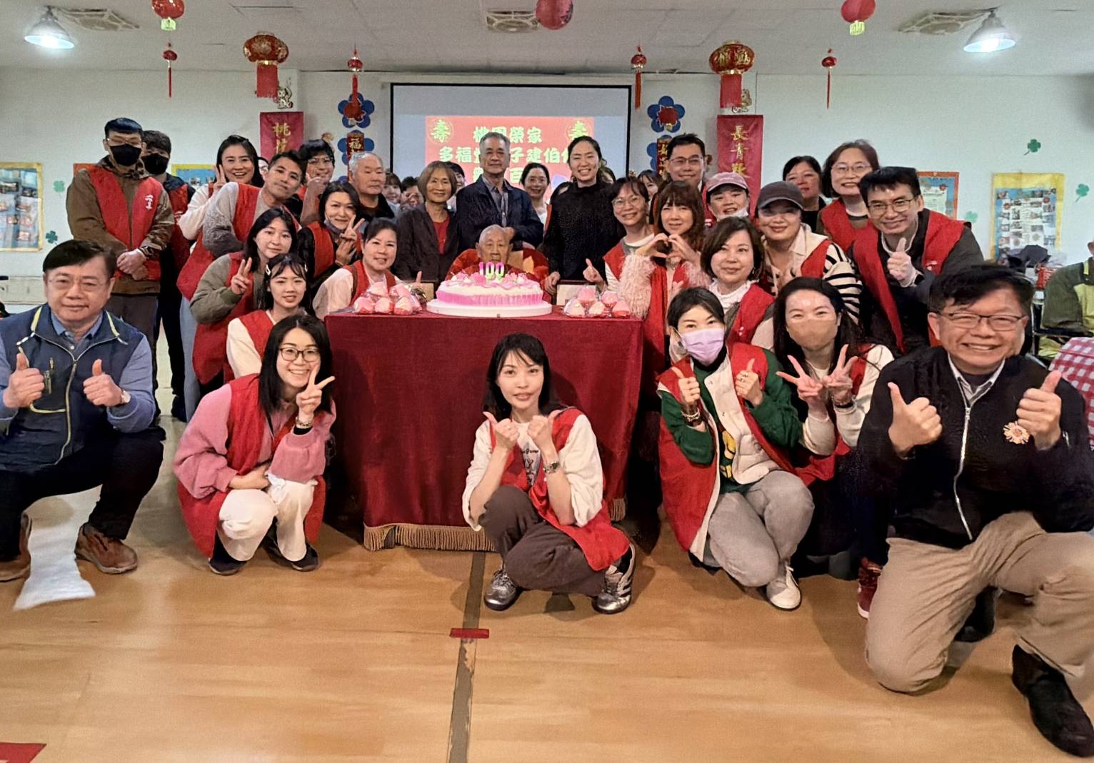 賀壽儀式中,主任頒贈總統及行政院院長祝賀壽屏,以及主任委員致贈之金壽桃金飾與祝壽禮金,象徵國家對百歲榮民的敬重與感謝。采盟邱博文副理偕同志工夥伴獻唱祝壽歌曲,並送上親手製作的春節賀卡,場面溫馨感人。接續節目由采盟志工夥伴精心策劃,歌王歌后輪番上陣,帶動長輩歡唱經典國、台語歌曲,穿插抽球贈獎遊戲,人人有獎,歡笑不斷。現場安排精緻鹹甜點百匯,榮家準備象徵吉祥的壽桃,將會場布置為春酒桌宴形式,重現傳統年節互道祝福的溫馨場景。朱子健伯伯開心表示:「今天像辦喜宴一樣熱鬧,謝謝大家的祝福。」