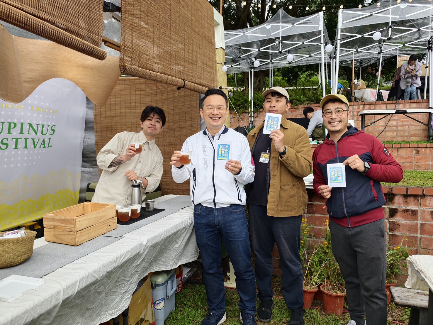 今日大北坑休閒農業區湧入不少遊客前往欣賞魯冰花美景,蘇俊賓也在天穿日儀式前到在地客青籌組的文創市集參觀,並親手搗製客家糍粑,與民眾親切互動。